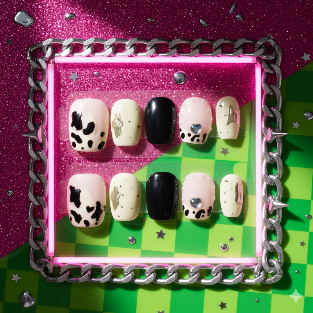 Playful cow-print patches meet soft cream tones, jet-black accents, and a sprinkle of gold foil. A touch of blue crystal adds whimsical sparkle, making this set a charming blend of rustic chic and modern fun. Perfect for casual outings, coffee dates, and countryside escapes.
