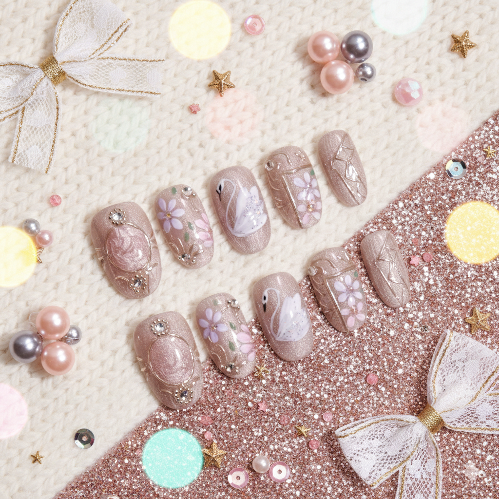 Indulge in the exquisite artistry of our Hakuchō no Mizuumi set. These Handmade Press-on Nails are a breathtaking example of the Wafu Aesthetic, featuring a luxurious base of champagne-rose silk cat-eye gel that shifts like liquid velvet. This Custom Japanese Nail Art set is defined by its unparalleled artisanal details: