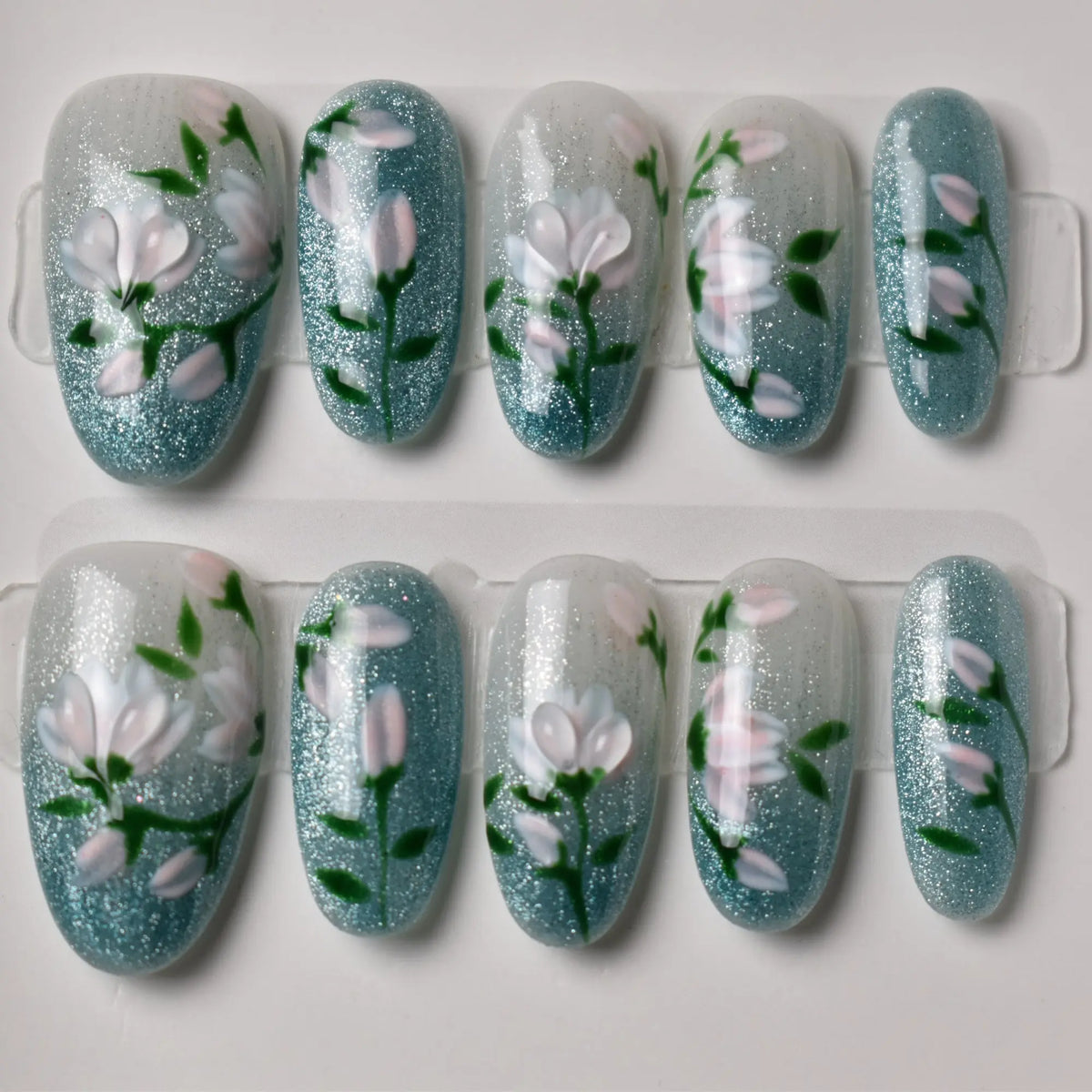 - 10 uniquely designed, hand-painted press-on nails made with high-quality UV gel.