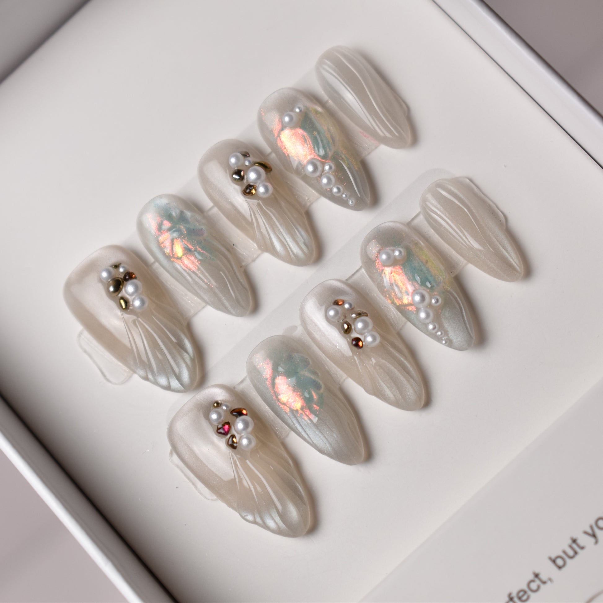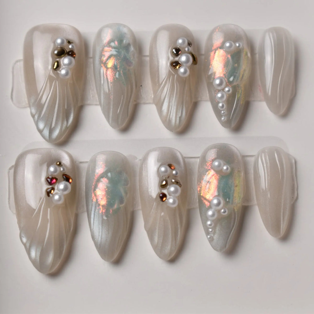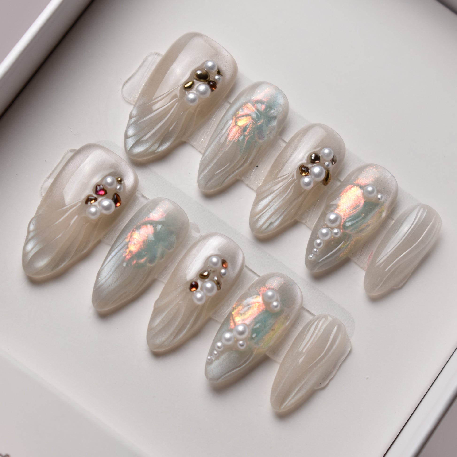 Iridescent white nails shimmer like fresh snow under moonlight, their sculpted wave textures catching every glint of light. Embedded within are holographic floral details and clusters of pearls in varied metallic shades, creating a sense of floating beauty. Perfect for winter weddings, ice queen looks, and serene moments by the water.