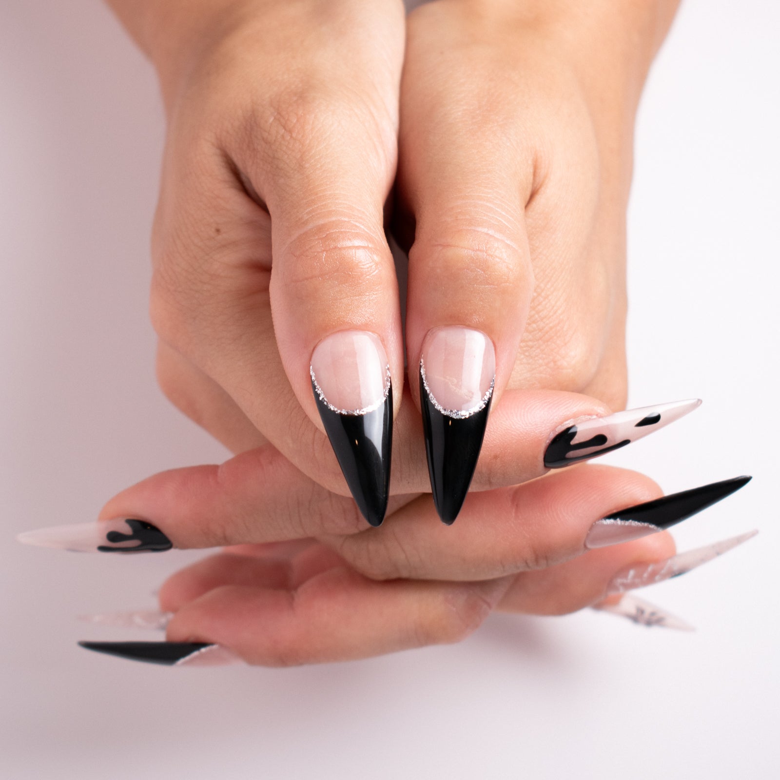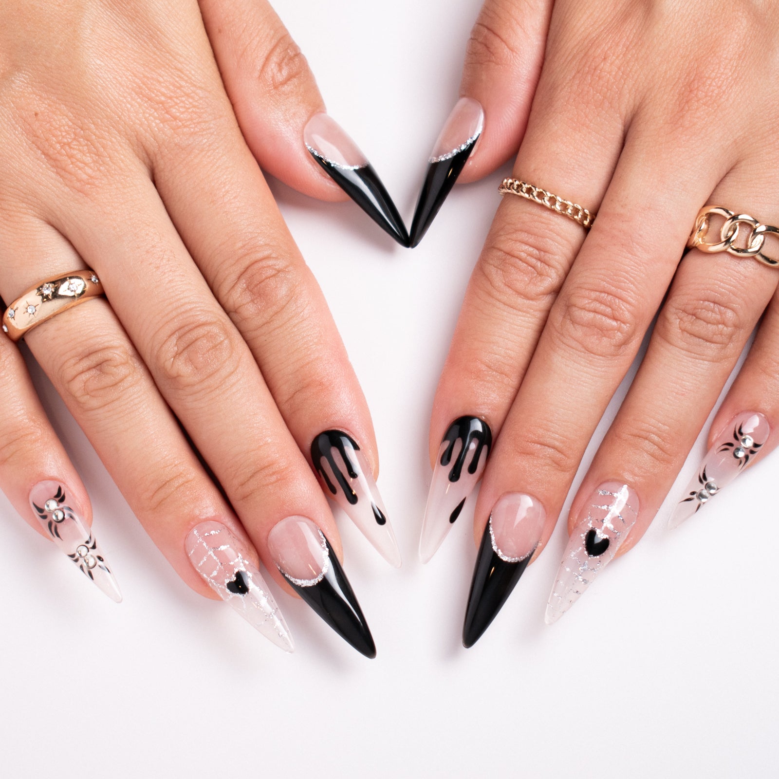 Unveil your dark side with the Midnight Web press-on nail set! These 33mm stiletto-shaped nails showcase an edgy, gothic style with black dripping designs, silver spider web accents, and daring rhinestones. The perfect accessory for your Halloween or spooky-season look!
