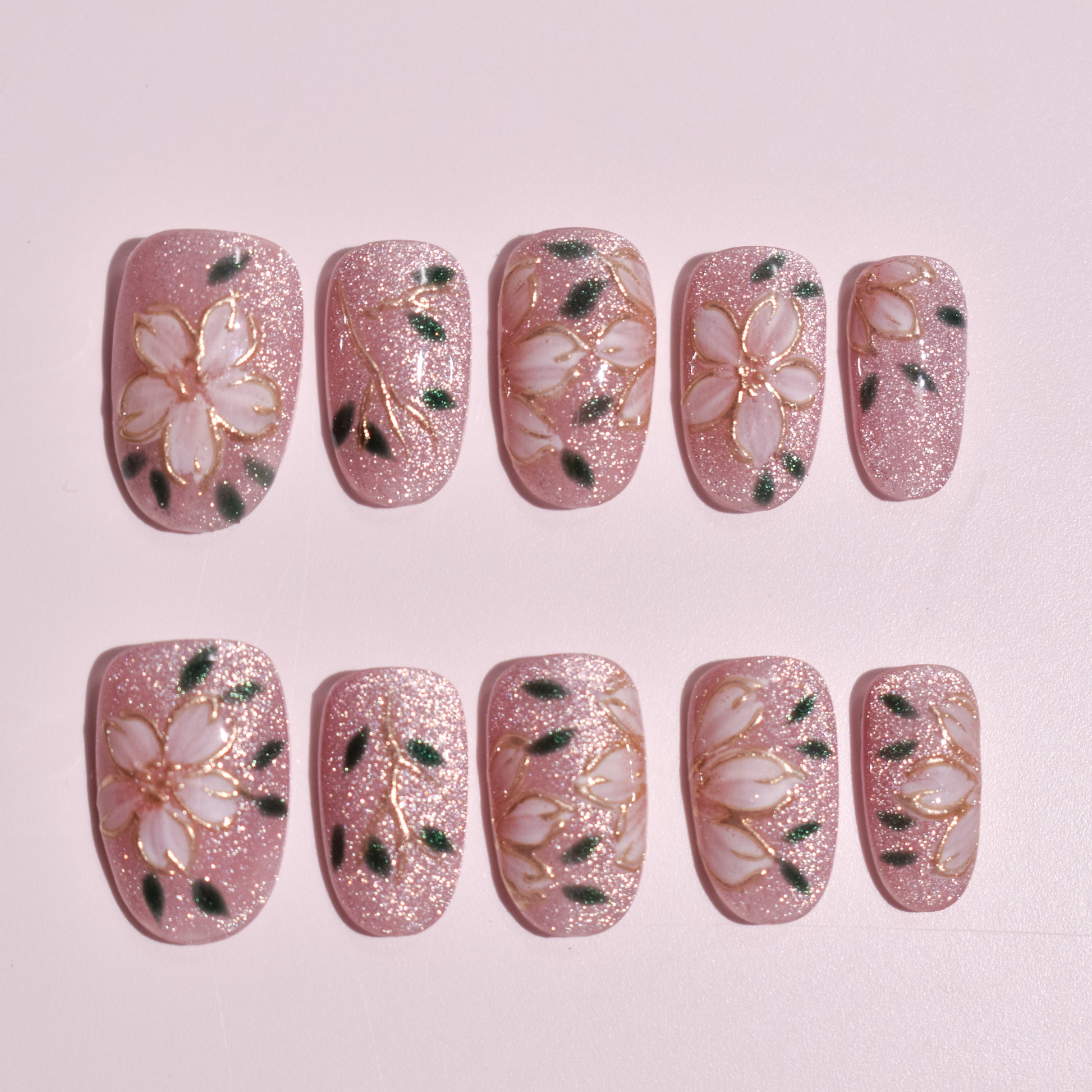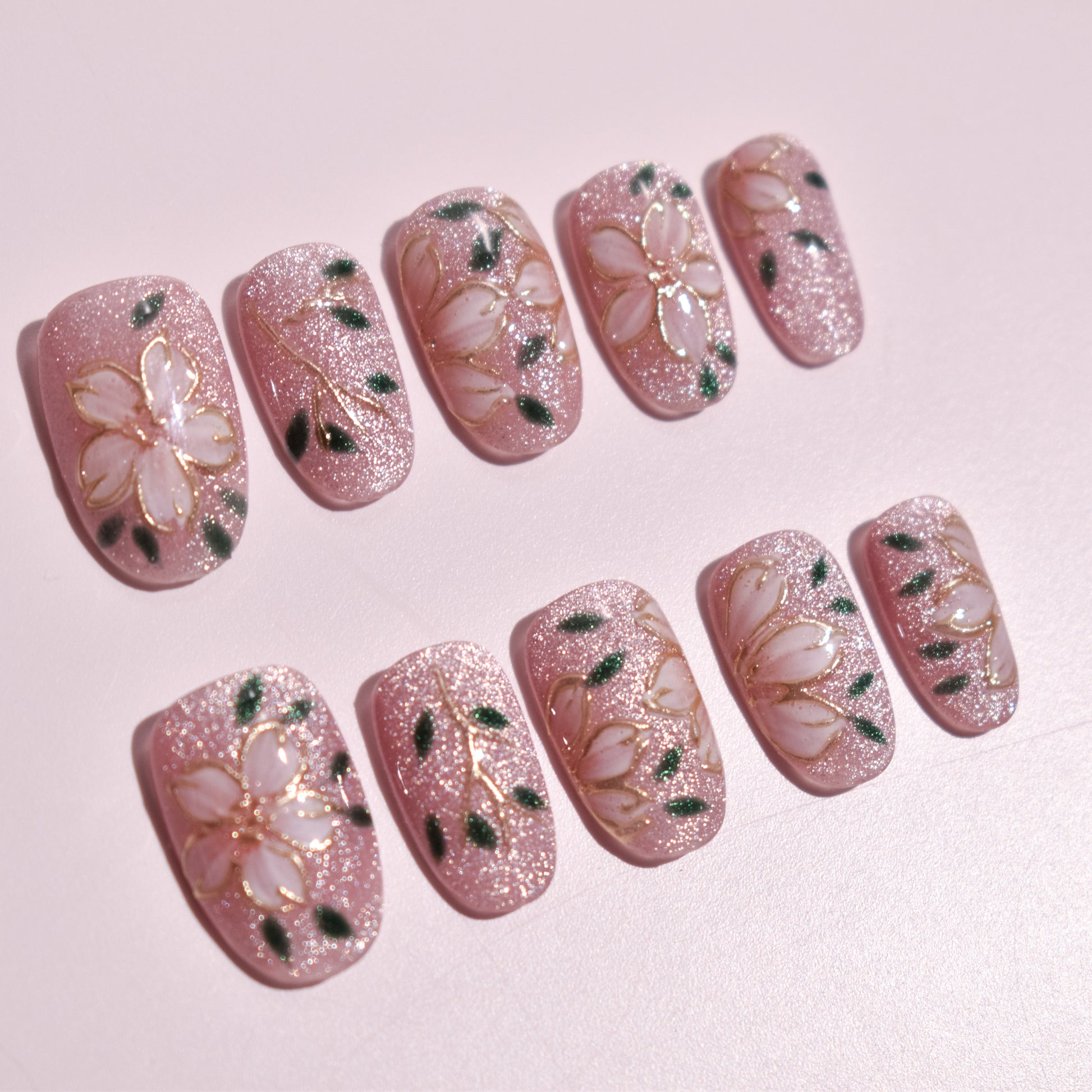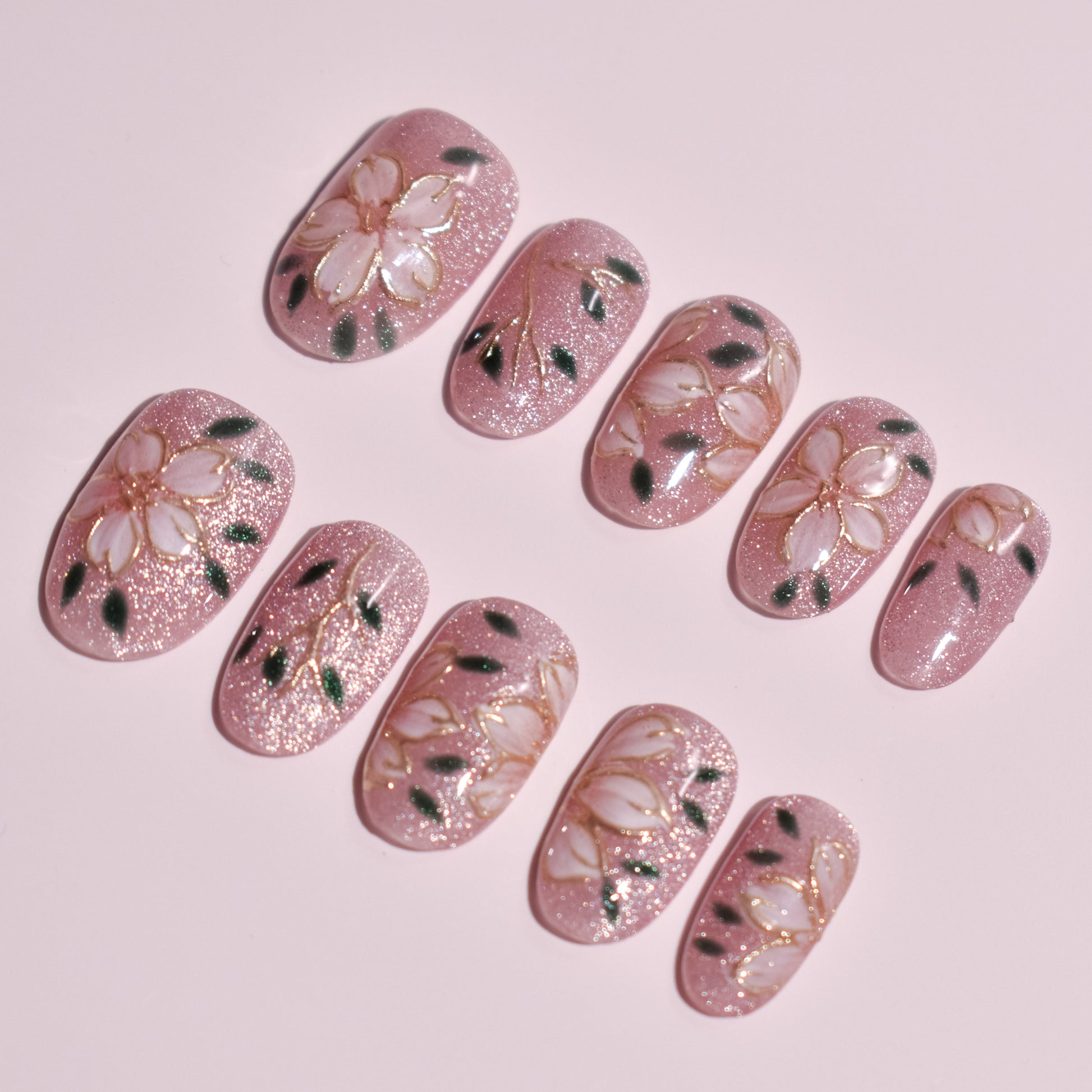 Hana Kasumi captures the softness of blossoms drifting through a gentle spring haze. This oval press-on nail set features a luminous rose-pink shimmer base layered with hand-painted floral petals, fine gold detailing, and subtle green leaf accents for depth and movement.