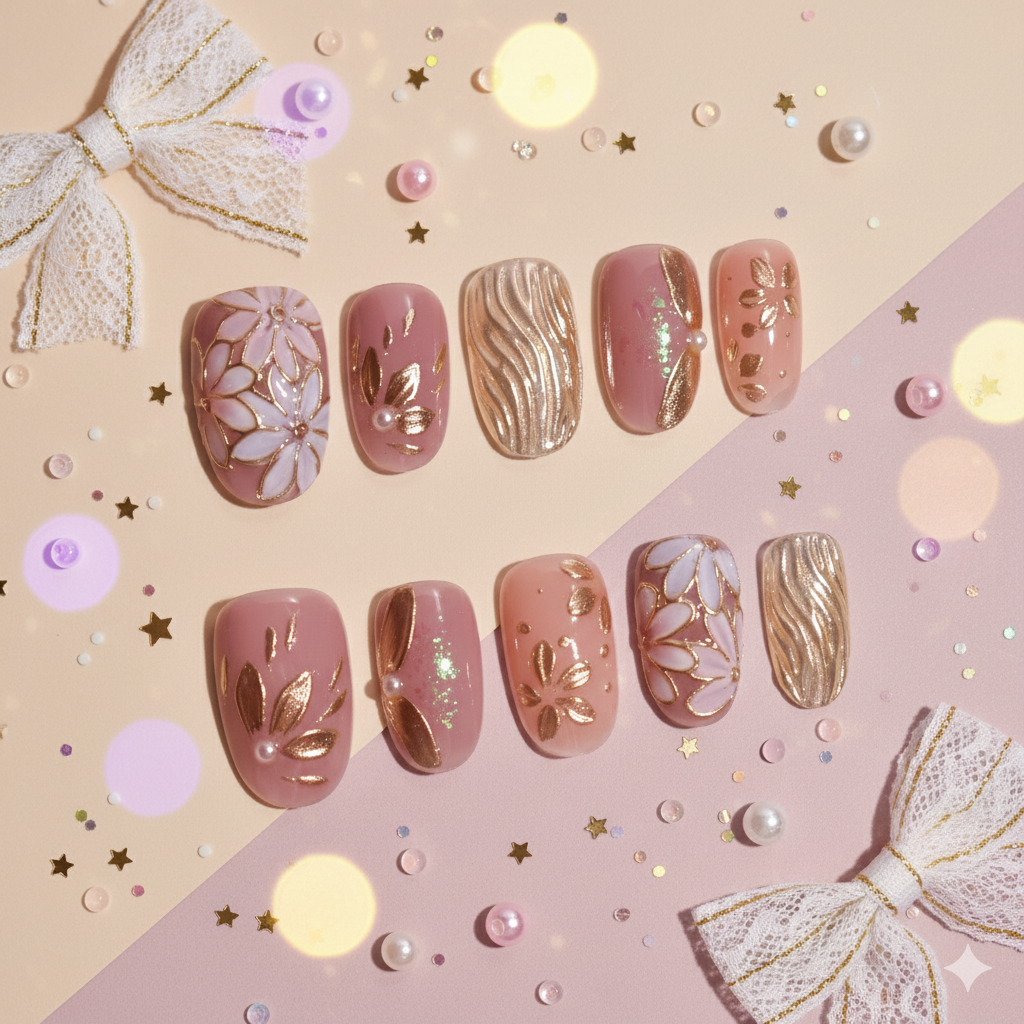 Hana Kintsugi is a refined oval press-on nail set inspired by the Japanese art of kintsugi—where beauty is found in gold-lined details and organic imperfections. Soft blush-pink bases are adorned with raised white florals, sculpted gold leaves, pearlescent accents, and flowing metallic textures that catch the light from every angle.