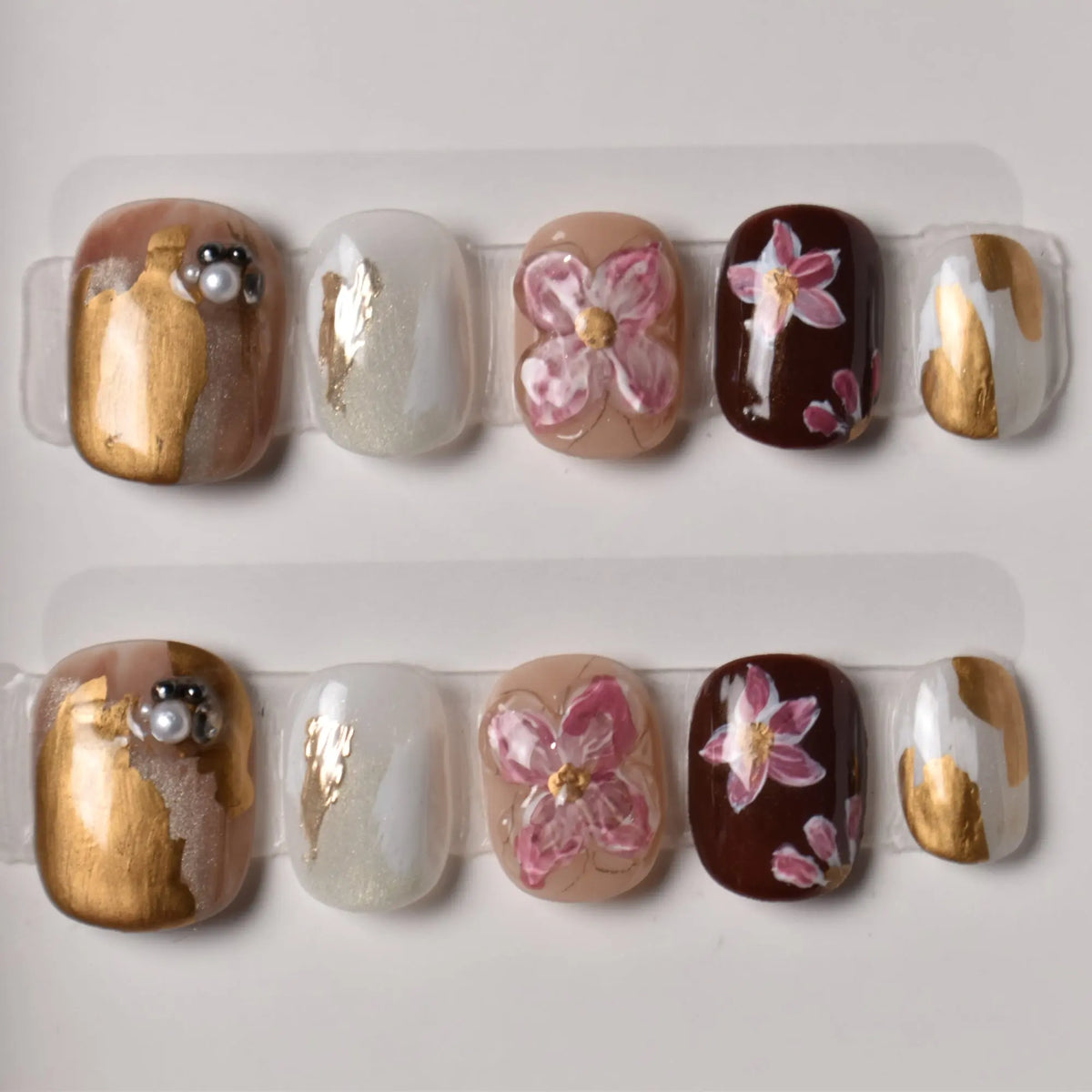 - 10 uniquely designed, hand-painted press-on nails made with high-quality UV gel.