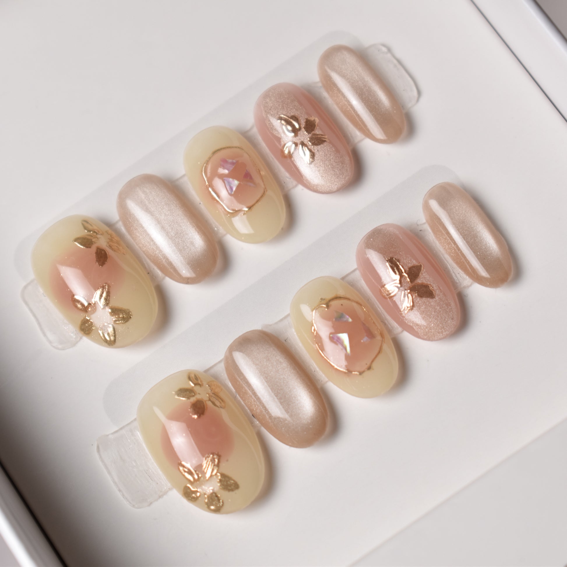 Milky almond and champagne tones frame blush oval cameos in liquid gold, with embossed petals and a whisper of iridescence—vintage romance with a keepsake-jewel charm.