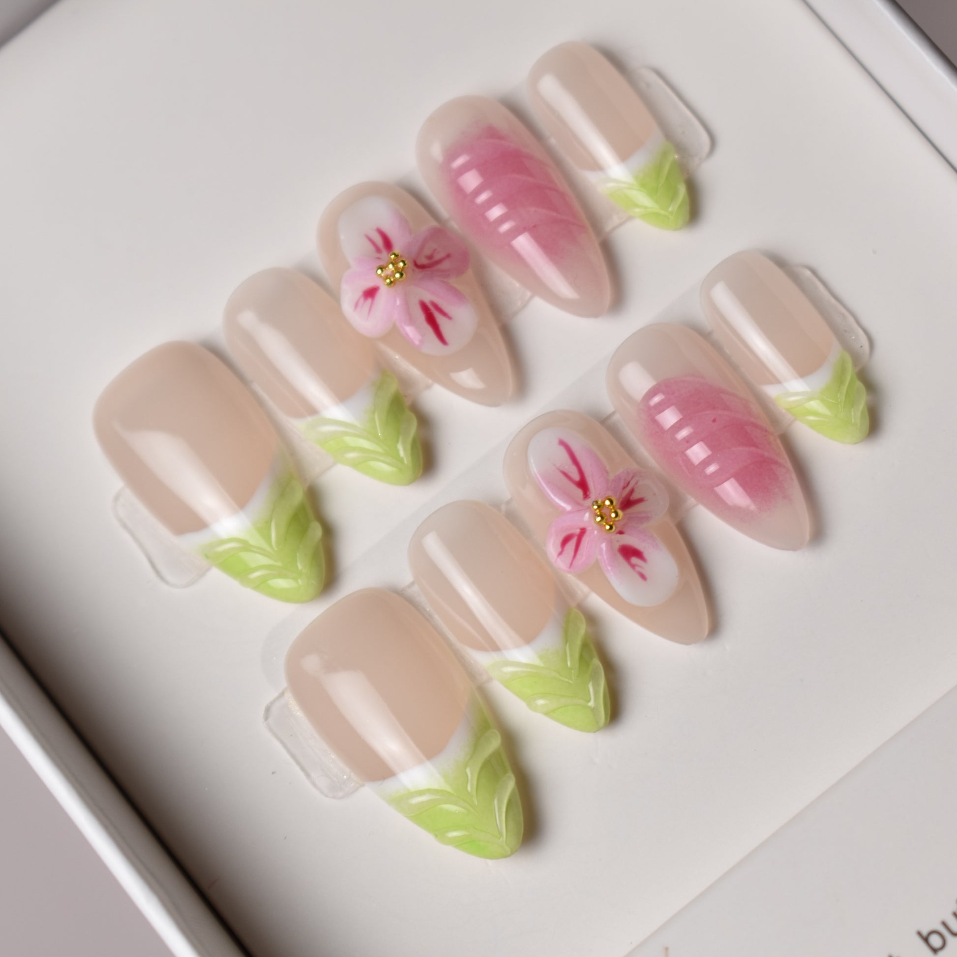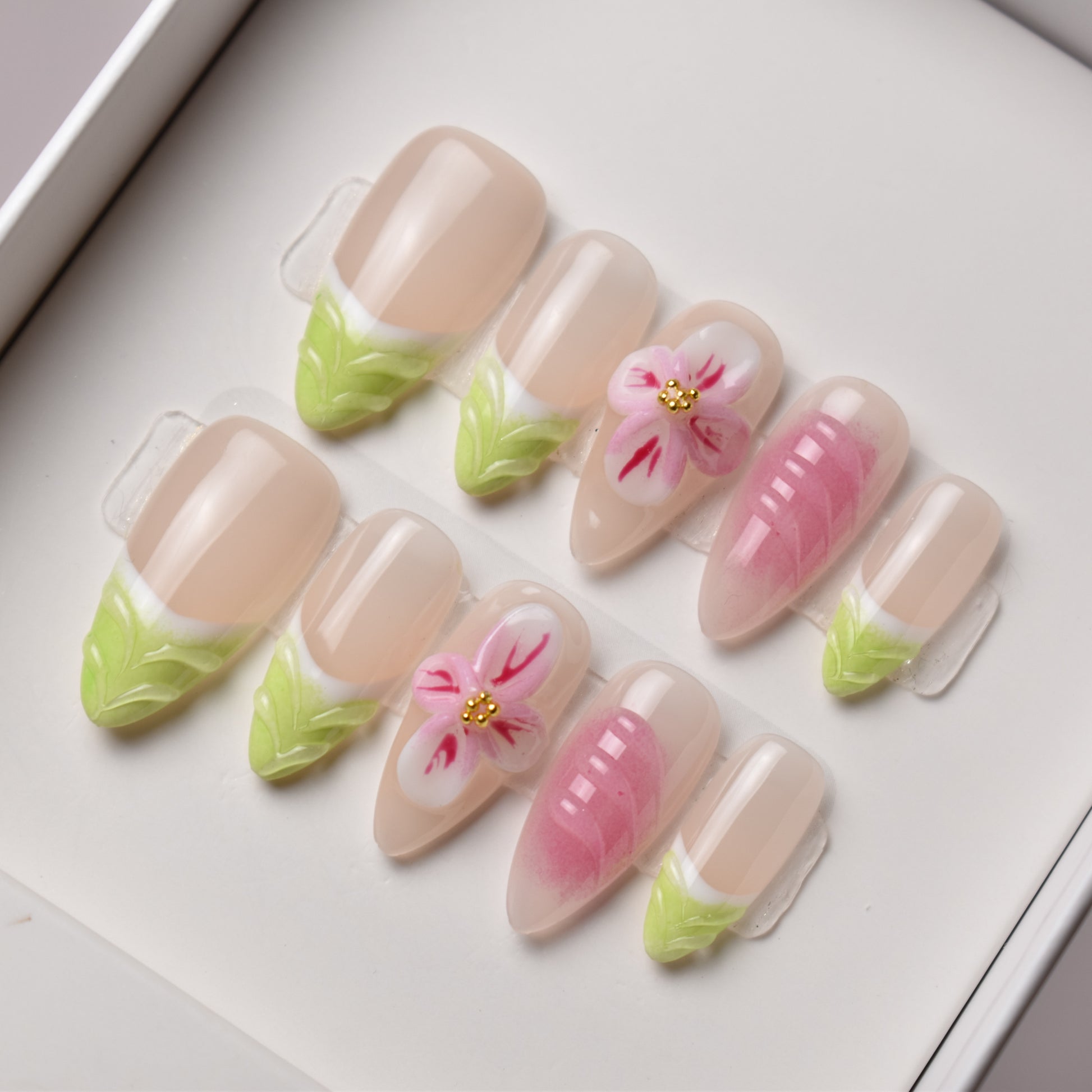Fresh green tips meet soft nude bases, framing vibrant pink blossoms in a lively celebration of spring. Delicate petal detailing and gentle color transitions make each nail feel like a small canvas of seasonal joy. Ideal for spring picnics, hanami celebrations, and days when renewal is in the air.
