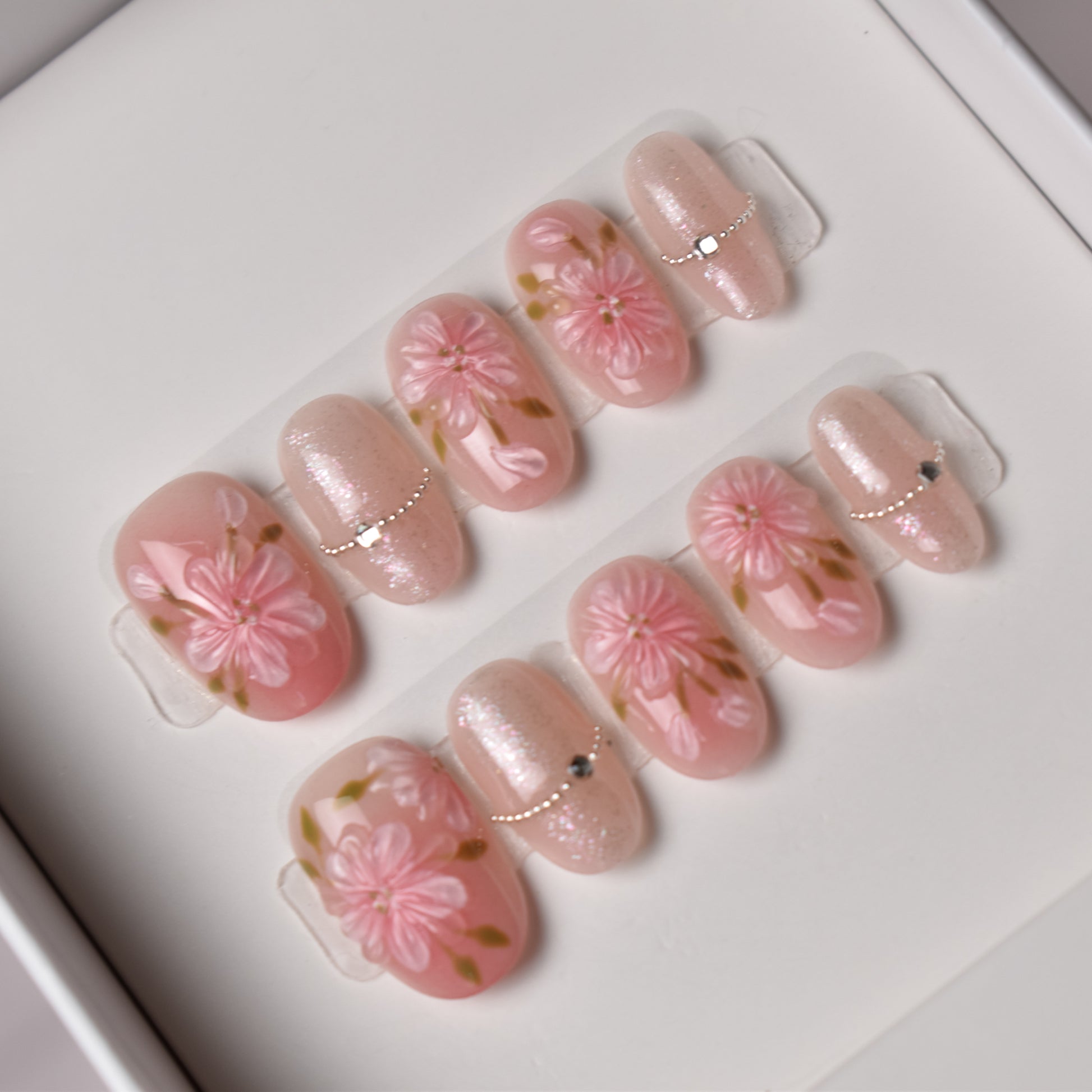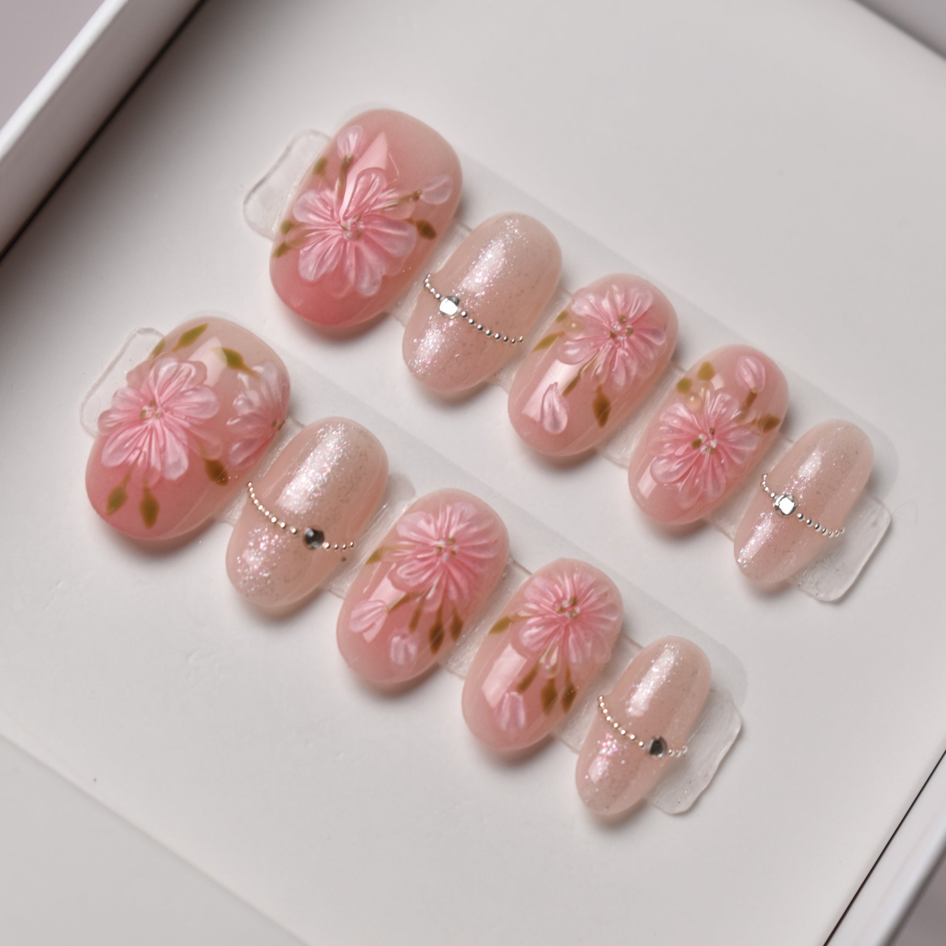 This delicate nail set blooms with soft romance, featuring hand-painted pink sakura petals gracefully layered over a warm blush base. Each floral design is accented with subtle green stems, creating a natural, fresh-picked look. The alternating nails shimmer with a pale, iridescent pink glitter base, adorned with dainty silver bead chains and a central gemstone, adding a refined sparkle. Perfect for spring weddings, hanami picnics, or anyone who wants to carry the gentle beauty of cherry blossoms at their fingertips.