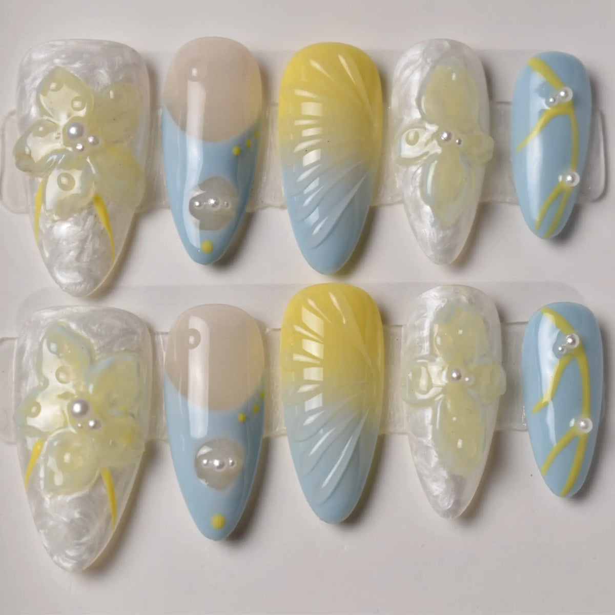 A joyful pairing of lemon yellow and sky blue dances across the nails, brought together by pearlescent blossoms that glow like sunlight streaming through stained glass windows. Tiny crystal accents add dimension, catching the light with every movement. This design radiates optimism and regal charm, perfect for spring celebrations, daytime events, and any moment when you want to carry sunshine at your fingertips.