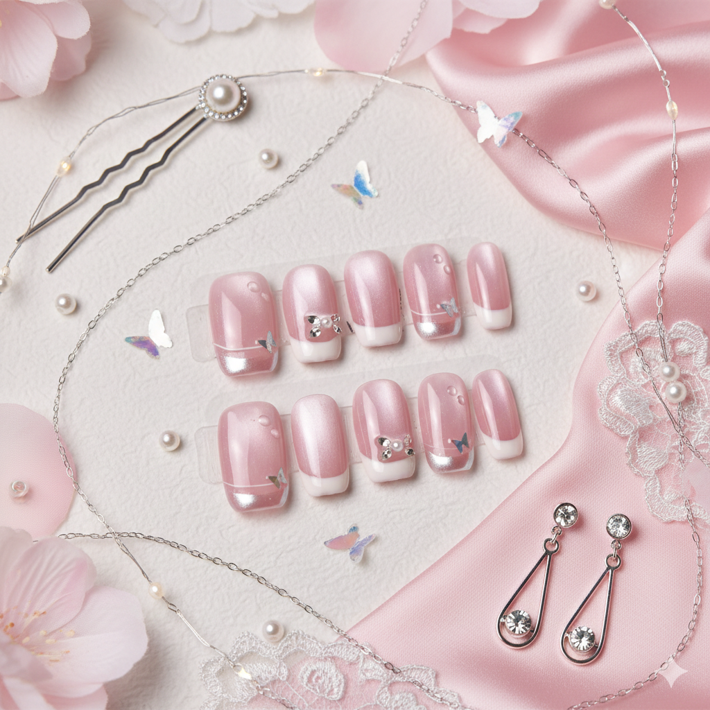 Sweet petal-pink shimmer meets crisp white tips and mirrored silver smiles, adorned with dainty bows, butterflies, and dew-like pearls for a playful yet polished look fit for tea dates and garden parties.