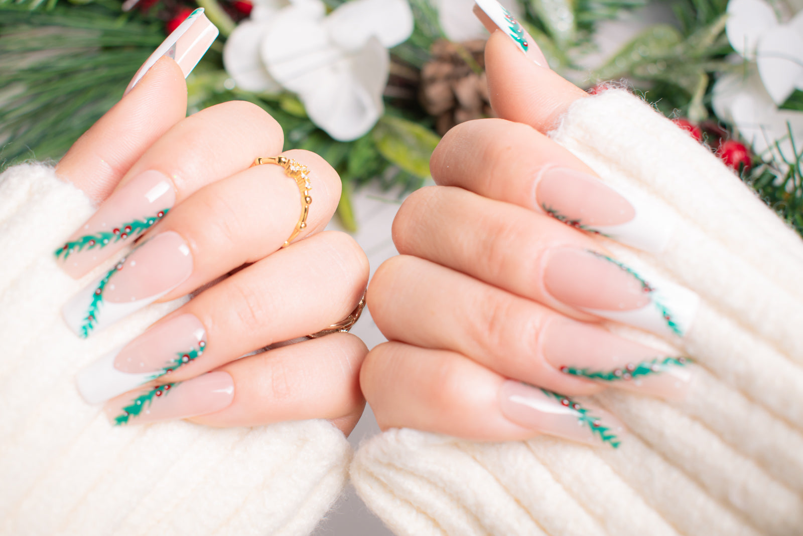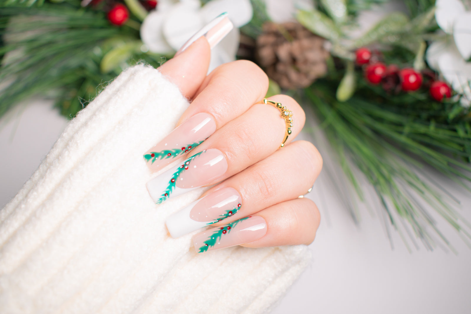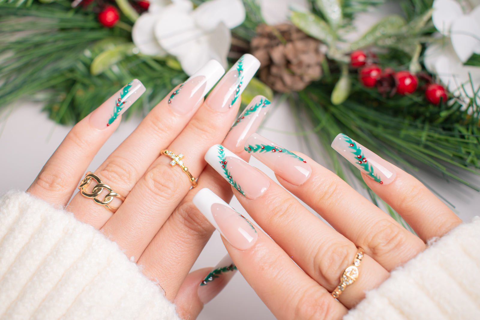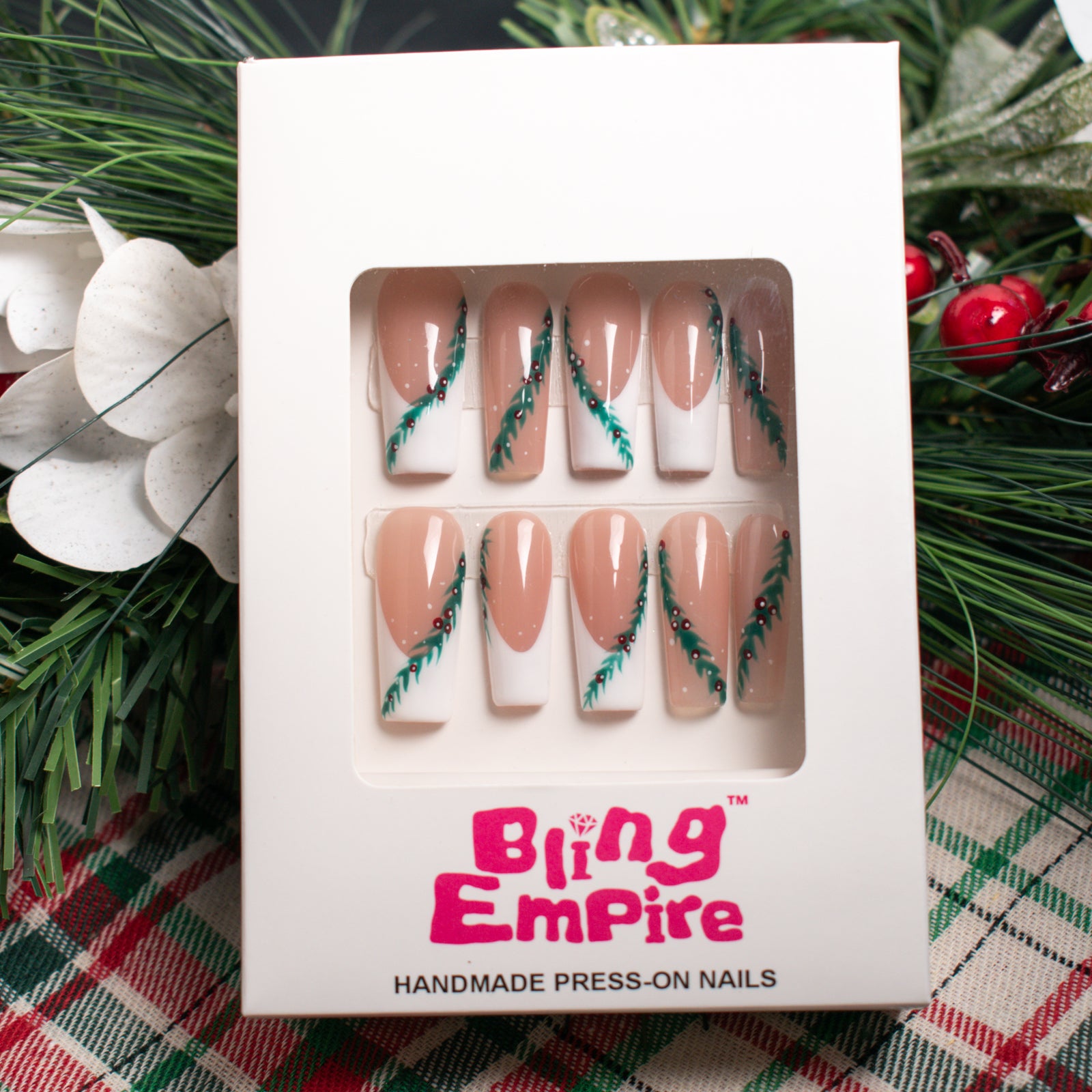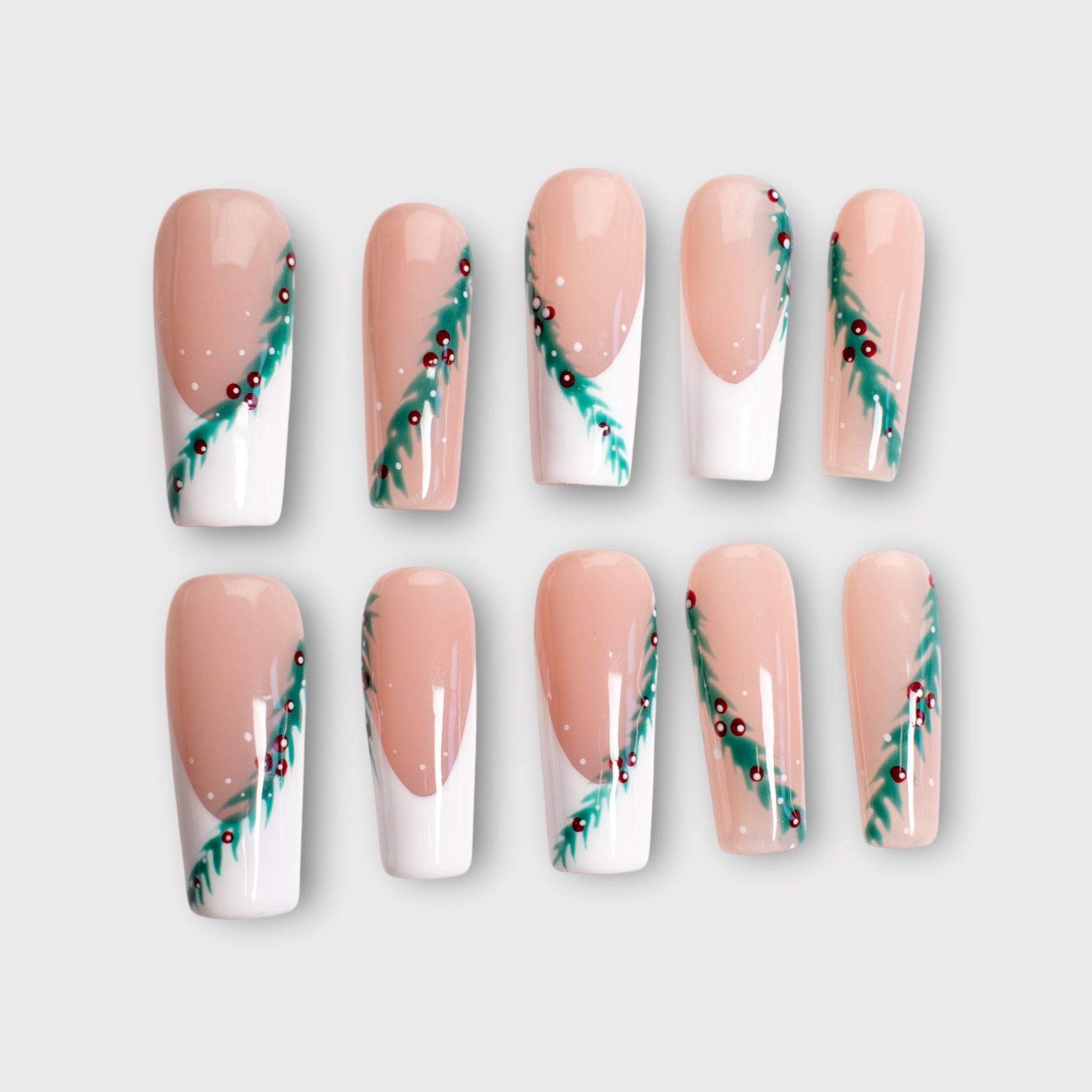 Celebrate the holiday season with Holly Jolly Greens, a design that exudes festive charm and natural elegance. Featuring hand-painted evergreen garlands adorned with red berry accents on a sophisticated nude and white base, these nails are perfect for spreading holiday cheer with a touch of class.