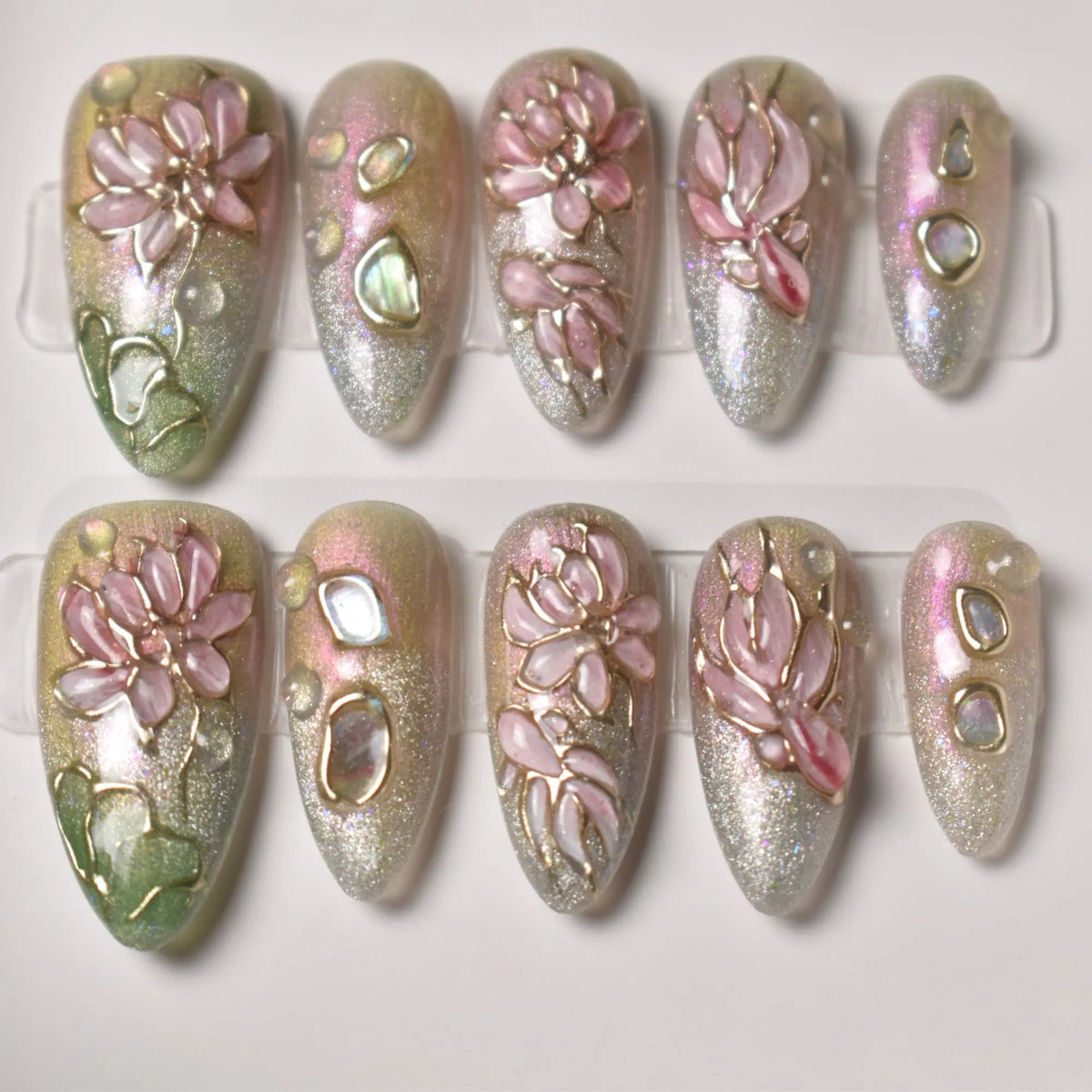 Translucent waters ripple in shifting iridescent tones, carrying pearl-pink lotus blooms edged with gold. Shell-like accents glisten along each curve, evoking treasures drawn from a sacred lake at first light. This design holds the stillness of dawn on a mythical shore, perfect for moments of contemplation and grace.