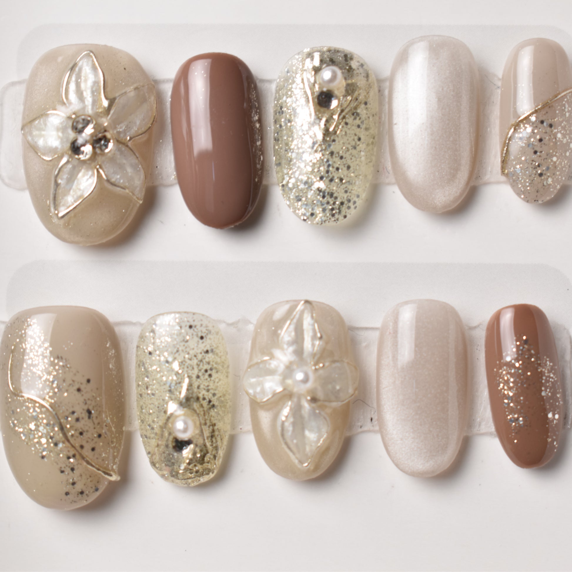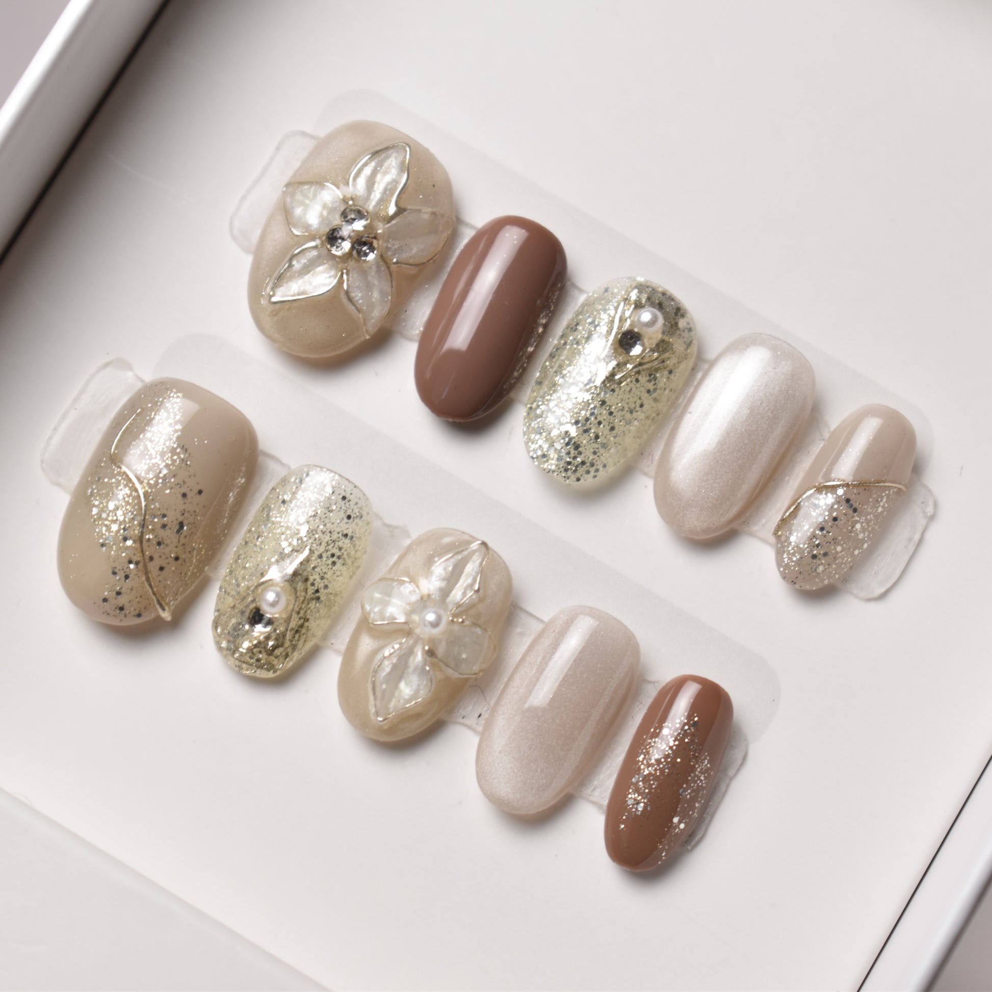 Shimmering champagne and almond tones bloom with translucent petals, each kissed with a pearl heart and crystal sparkle. A dusting of glitter evokes winter frost catching the dawn light, turning the design into a wearable jewel. Perfect for occasions where grace and radiance intertwine.