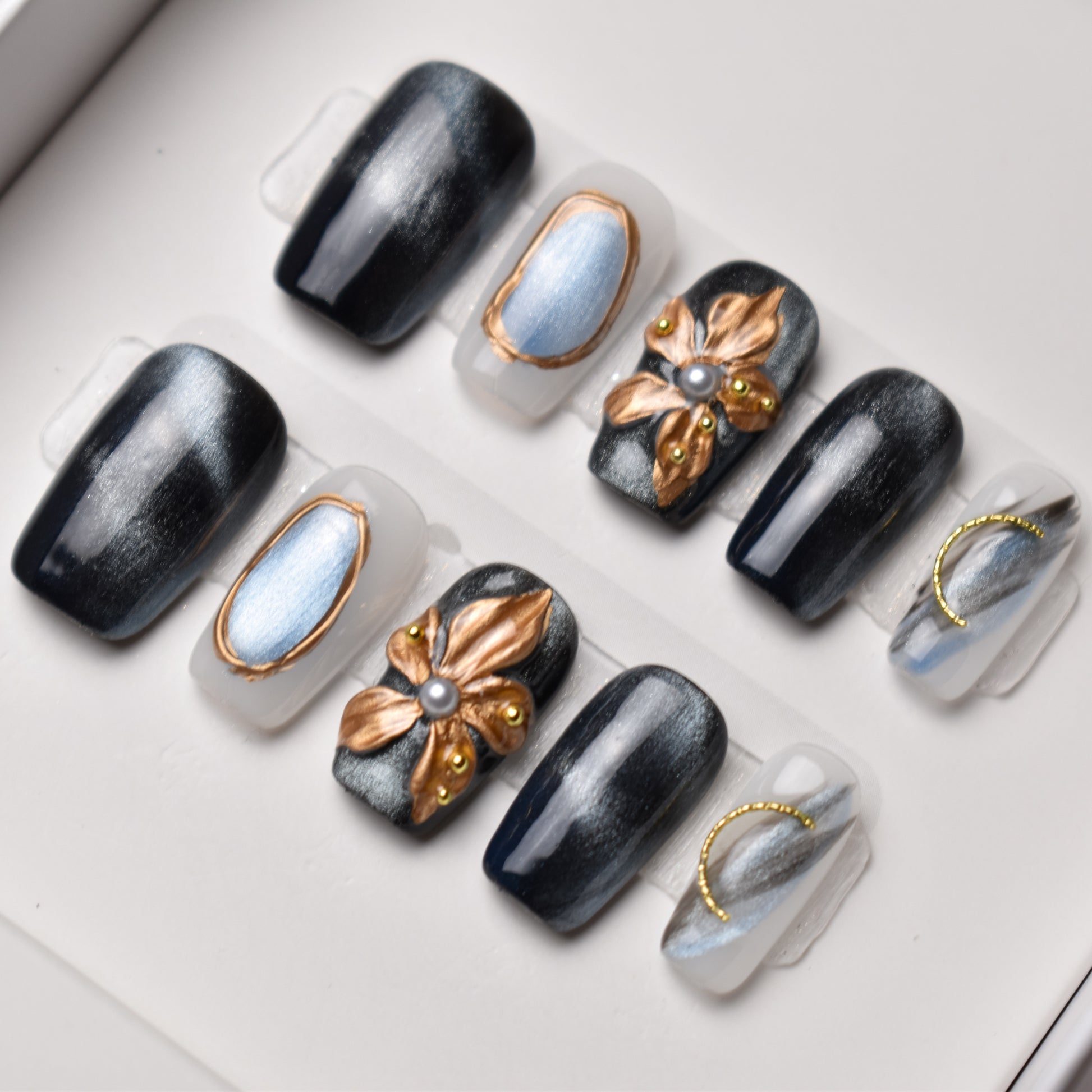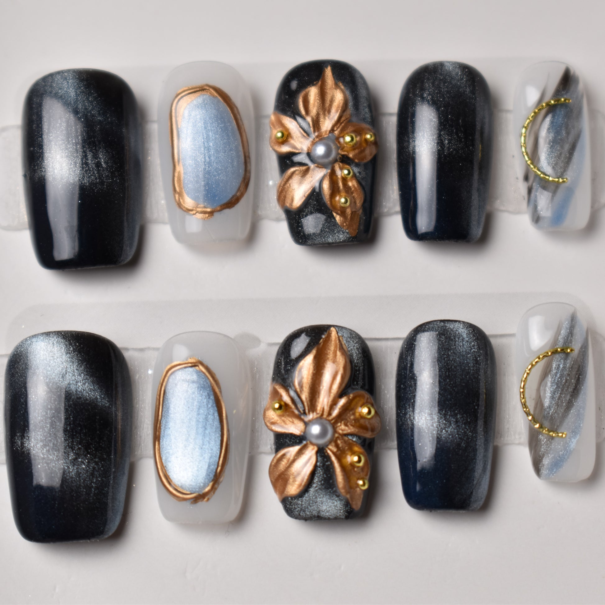 This serene set blends soft nude and white tones with delicate sky-blue marbling at the tips, outlined in fine silver glitter for an elegant finish. Two accent nails feature hand-sculpted 3D blue flowers with gold bead centers, evoking the calm beauty of blossoms against a clear spring sky. The combination of airy colors and subtle shimmer creates a refined, peaceful look that feels both fresh and timeless.