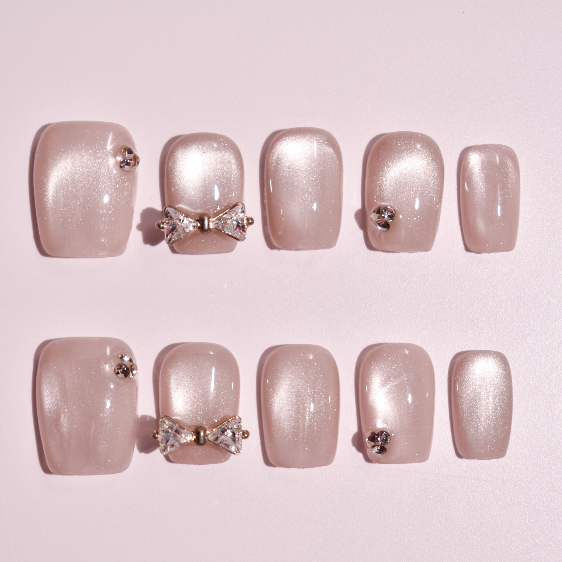 Hoshimi no Ribbon (星見のリボン, Ribbon Under the Stars) is a refined short square press-on nail set designed for soft glamour and everyday elegance. Featuring a luminous nude-pearl base with a subtle shimmer, this set is elevated by delicate crystal accents and a statement bow charm that adds a touch of romantic luxury without overwhelming the look.