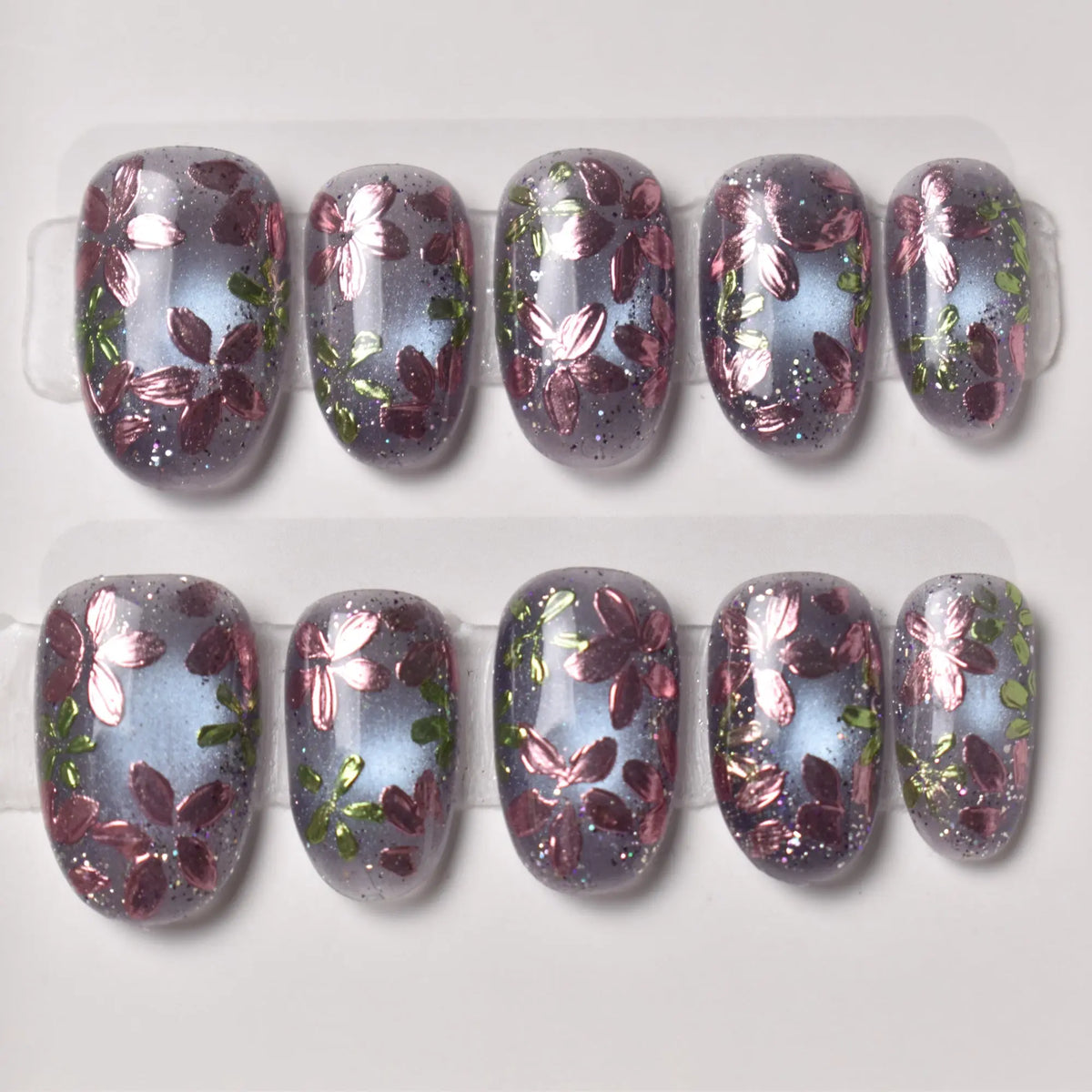 - 10 uniquely designed, hand-painted press-on nails made with high-quality UV gel.