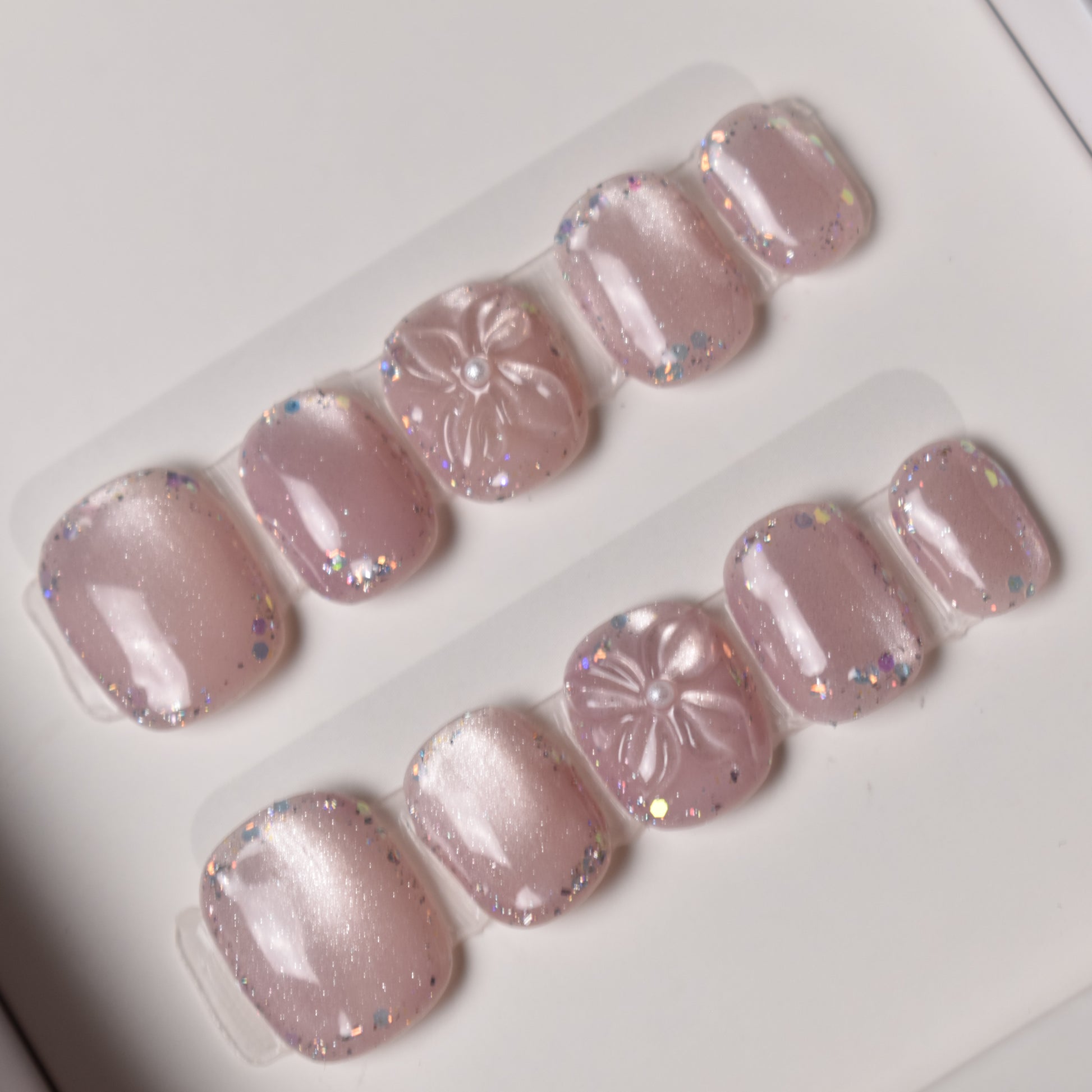 Soft blush tones shimmer like moonlight on silk, dusted with sparkling stardust. Sculpted floral accents bloom delicately on a pearlescent base, crowned with gentle iridescence. A dreamy choice for romantic evenings and celestial celebrations.