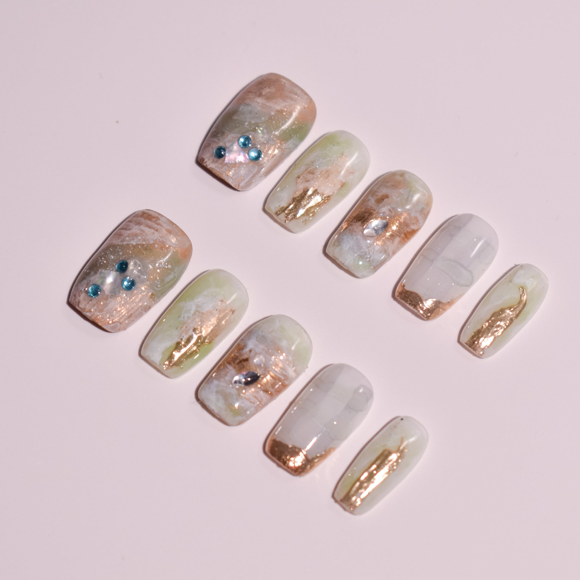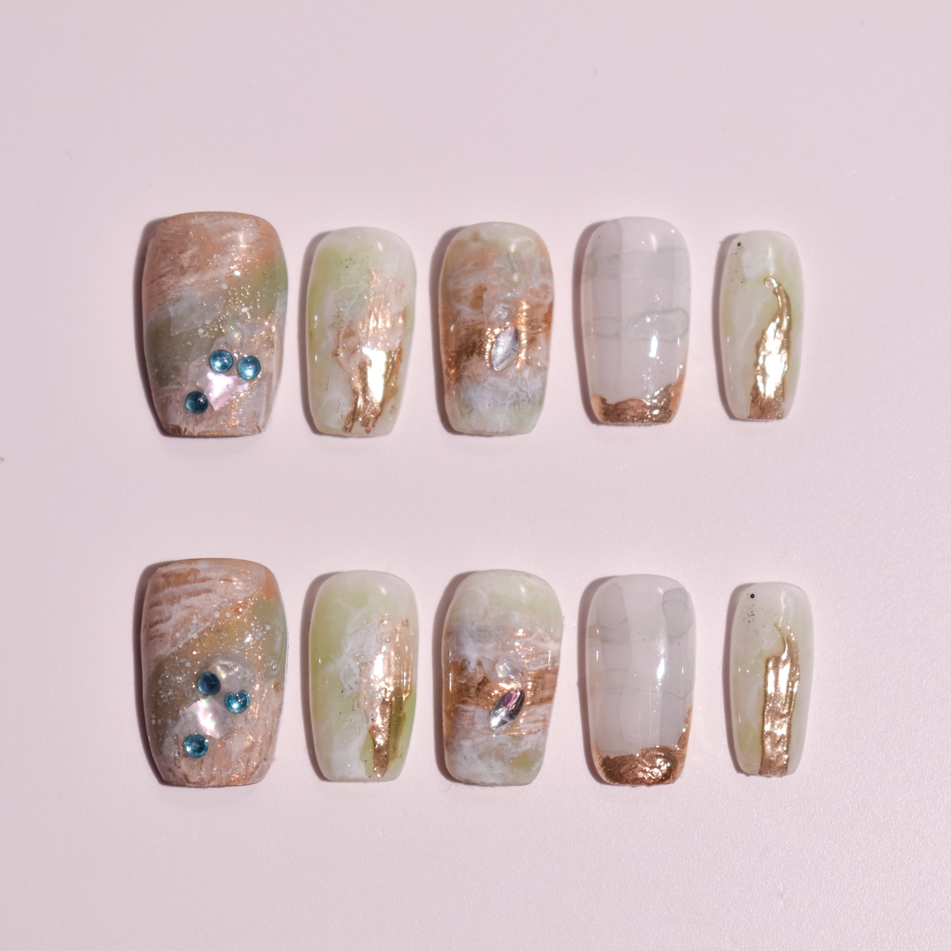 Jade Vein Alchemy is a refined square press-on nail set inspired by natural stone, jade mineral washes, and gilded imperfections. This design blends milky white, sage green, and warm beige marble with hand-applied gold foil accents and crystal details for a calm yet luxurious finish.