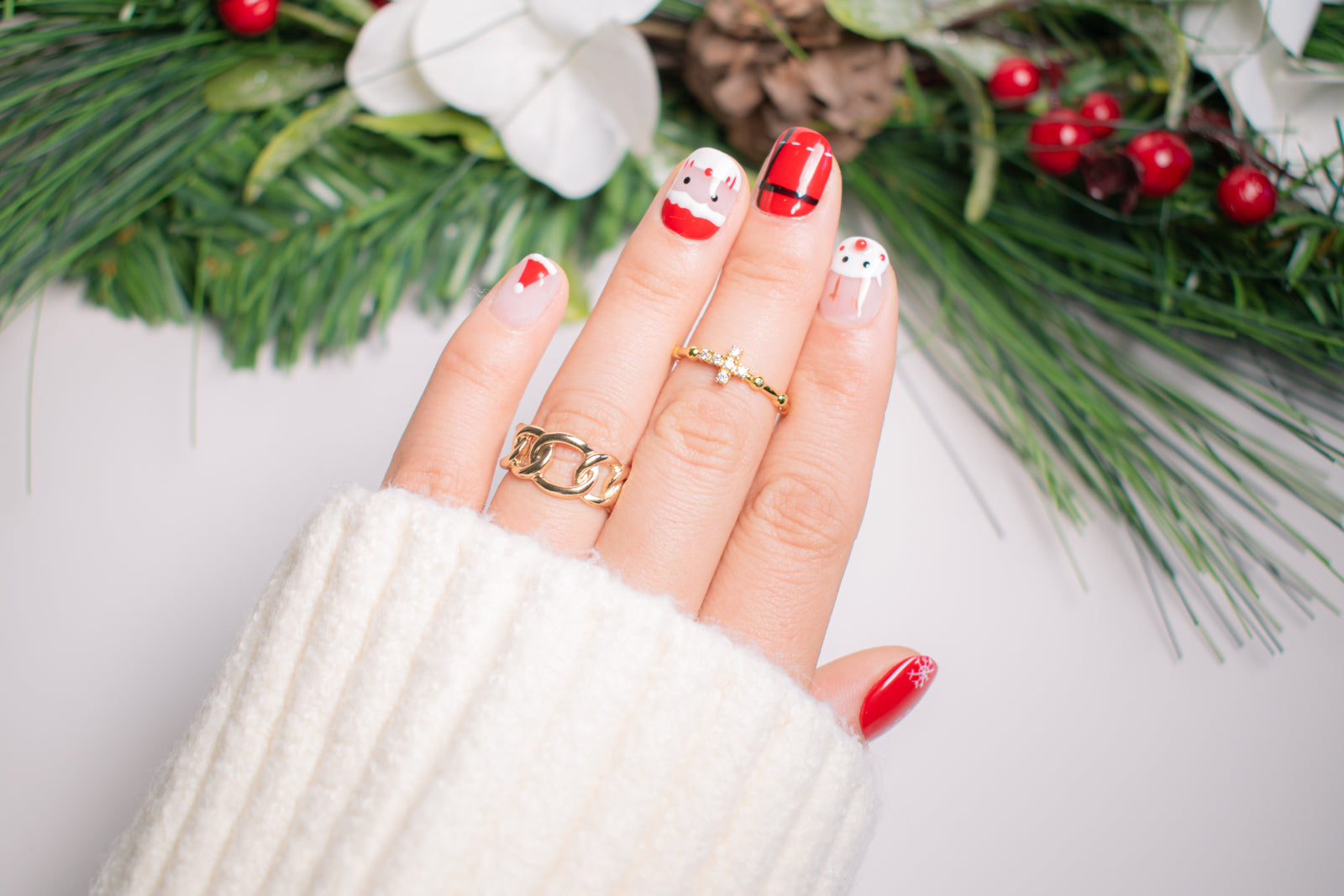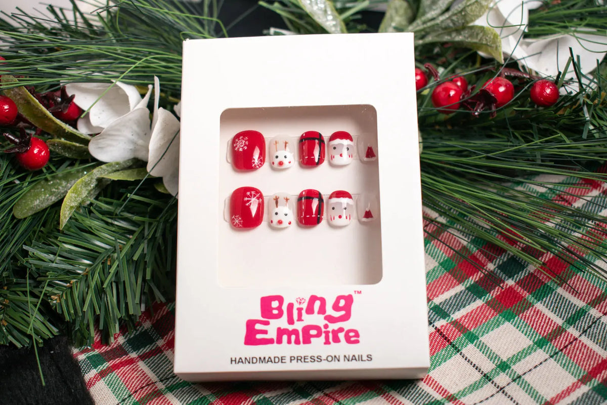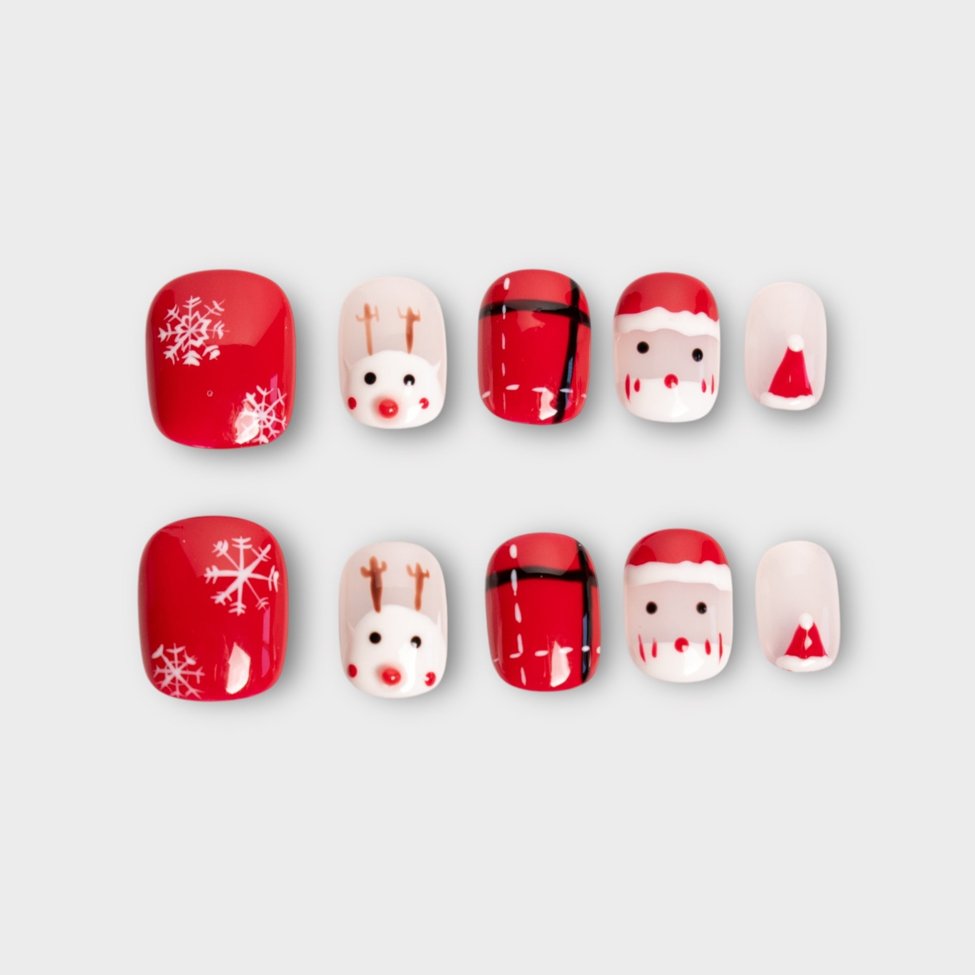 Bring the festive spirit to your fingertips with Jolly Holiday Cheer. This delightful set features adorable Santa Claus faces, playful reindeer designs, and classic snowflakes, all set against a vibrant red and white palette. Perfect for holiday parties or adding a touch of Christmas magic to your everyday look.