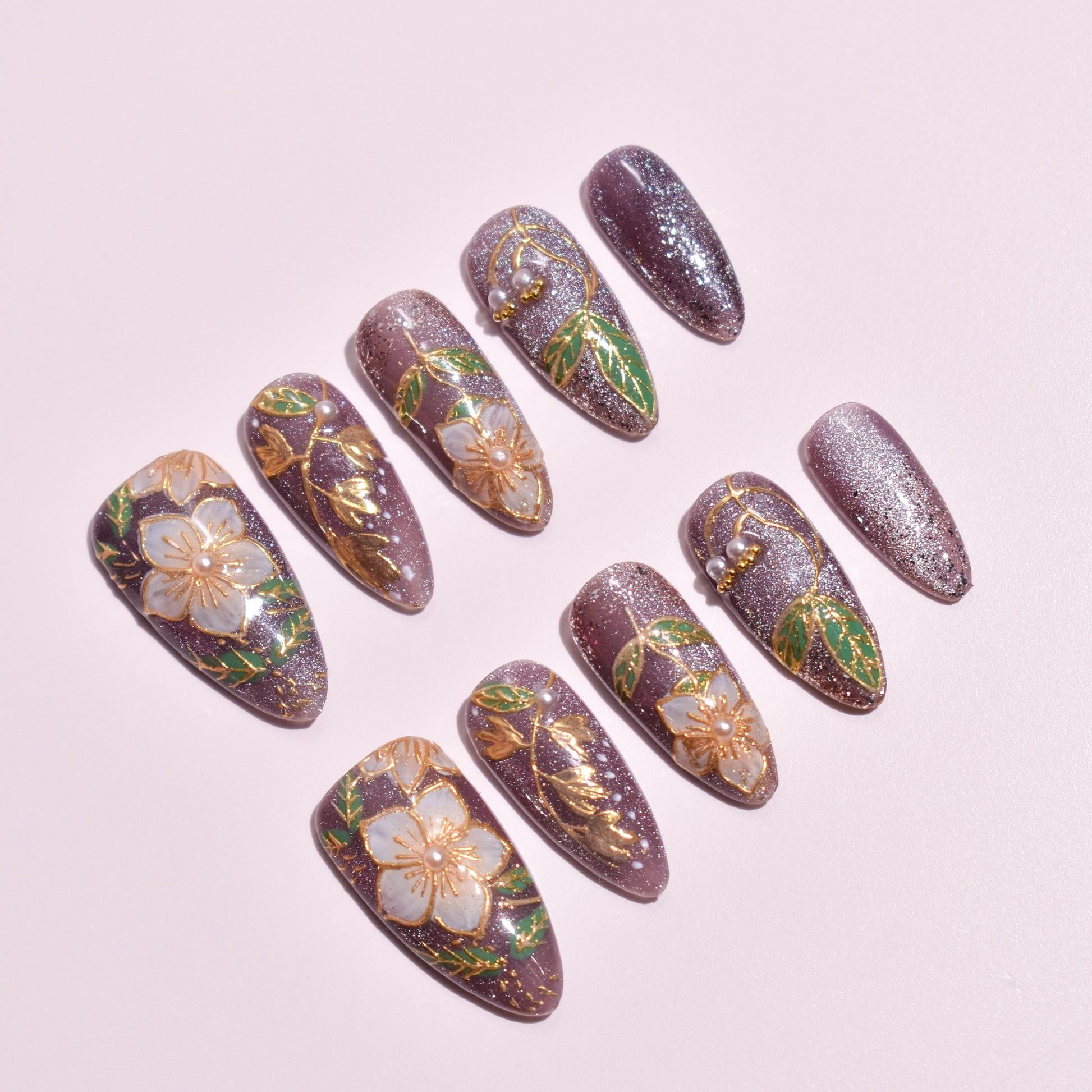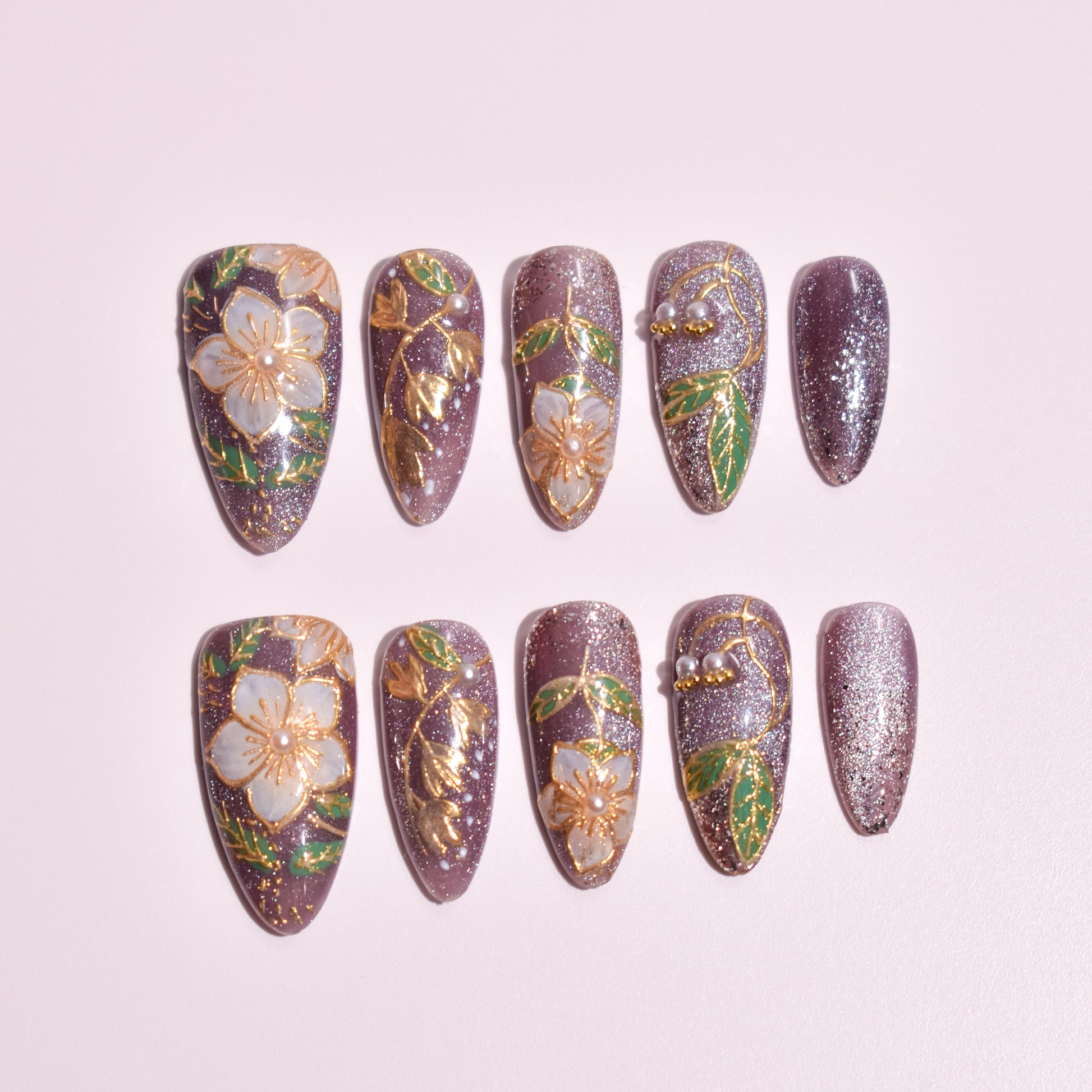 - 10 uniquely designed, hand-painted press-on nails made with high-quality UV gel.