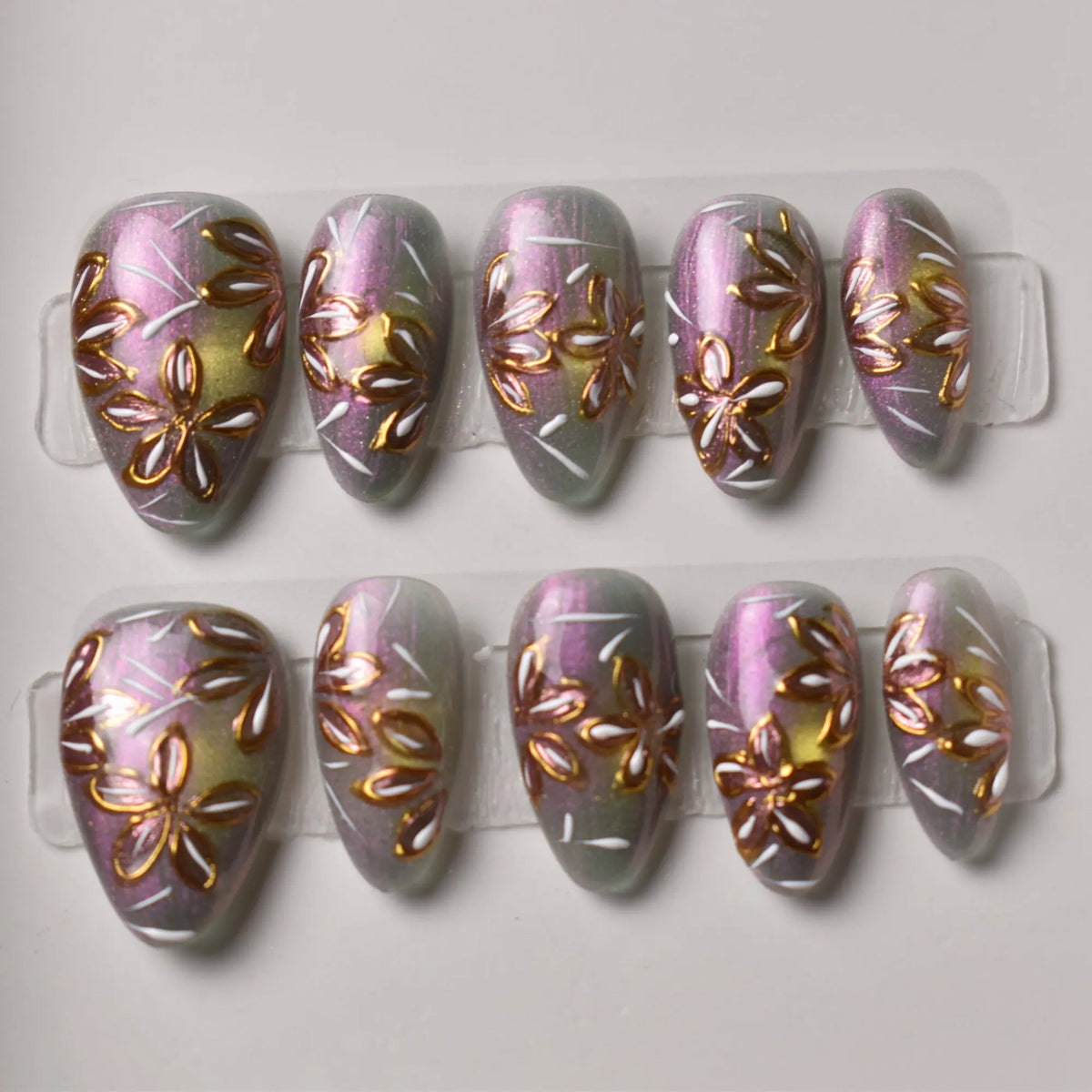Soft nude bases fade into lilac tips, accented with sculpted purple blooms and delicate bead centers. Playful patterns of dots and stripes mimic the gentle flicker of fireflies at dusk, casting a whimsical glow. Perfect for twilight strolls and dreamy evenings.