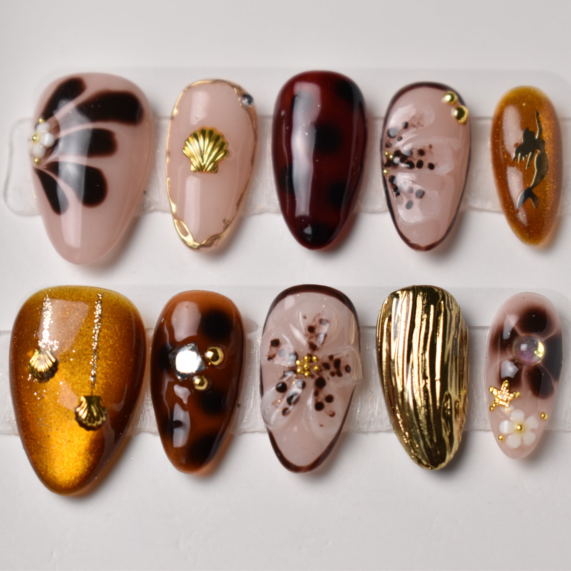 A luxurious blend of molten gold, deep tortoiseshell browns, and seashell embellishments, this set captures the elegance of the ocean at sunset. The shimmering metallic gold nails mimic the ripples of light across the water’s surface, while translucent amber tones evoke polished sea glass. Accents of delicate floral art, sculpted shells, and starfish charms add a touch of coastal romance, making this design perfect for those who want to carry the warmth of a golden seaside with them.