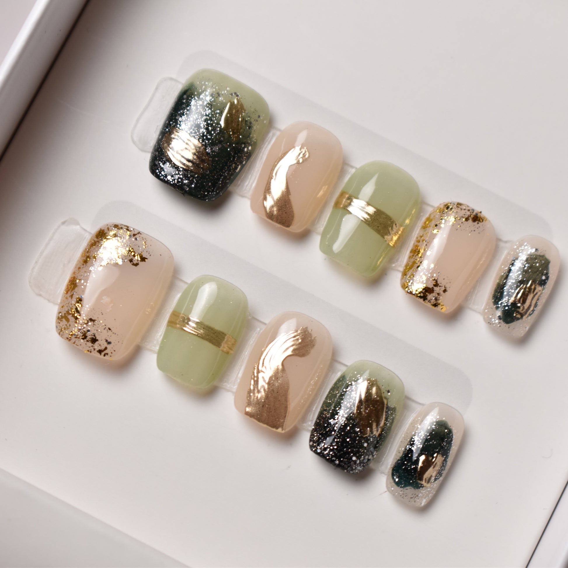 Gentle greens and warm nudes meet flashes of gold foil, reminiscent of autumn leaves scattered on forest paths. Elegant yet earthy, it’s a perfect harmony of nature and luxury.