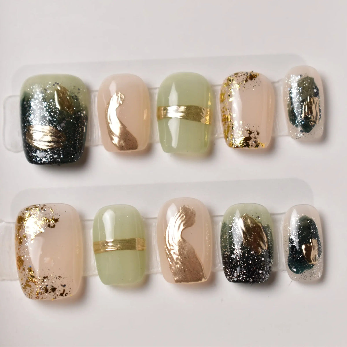 - 10 uniquely designed, hand-painted press-on nails made with high-quality UV gel.