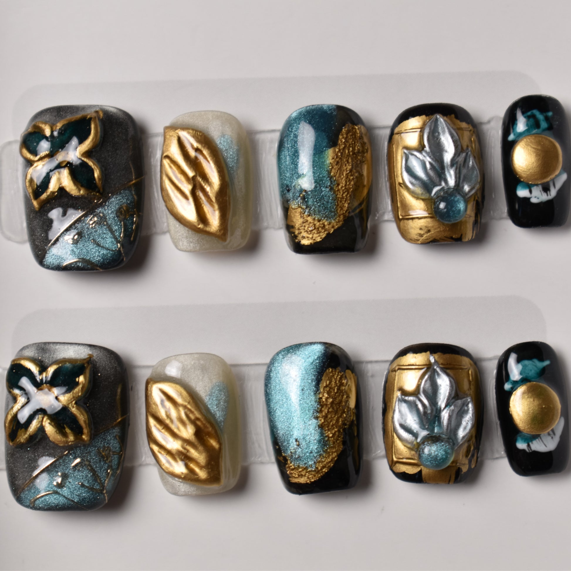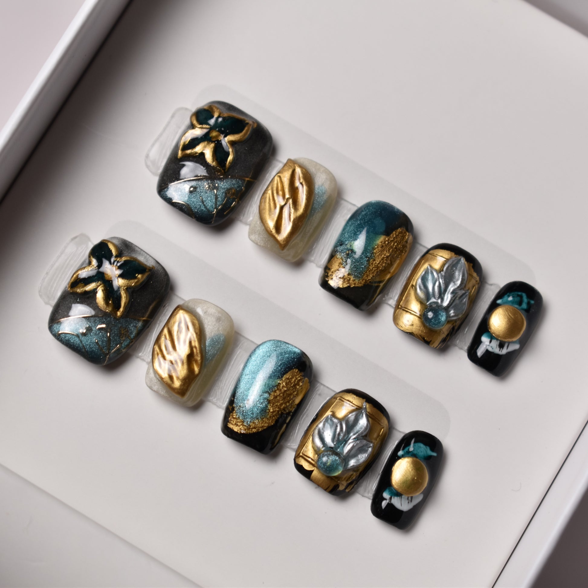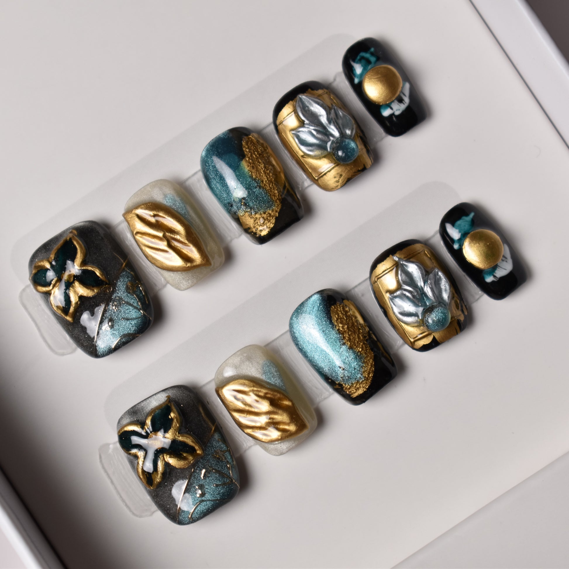 Deep teal and onyx meet molten gold in this luxurious design, adorned with sculpted floral and leaf motifs. Metallic textures and jewel-like accents give a celestial, almost mythical presence. Made for those who want their nails to speak of power and artistry.