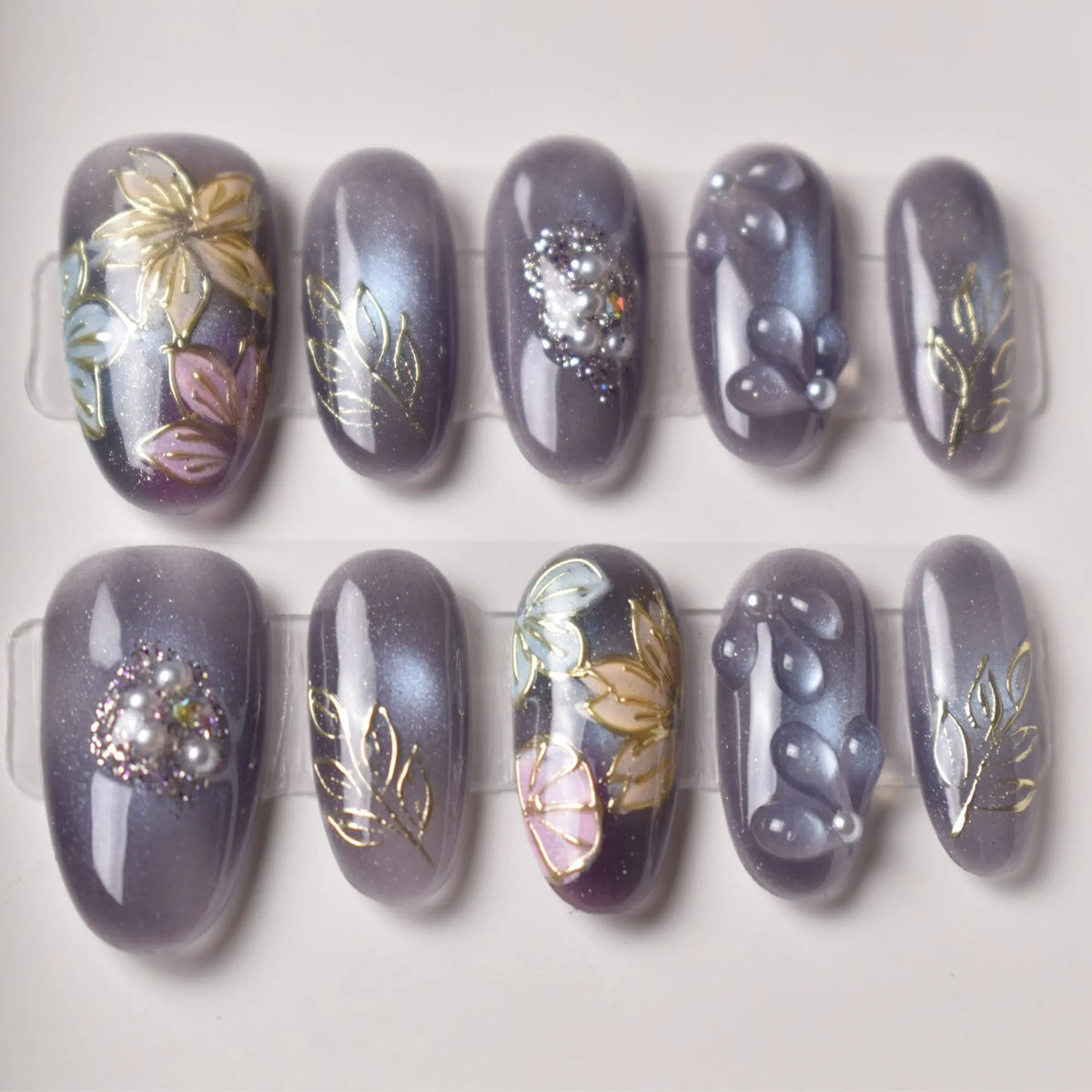 - 10 uniquely designed, hand-painted press-on nails made with high-quality UV gel.