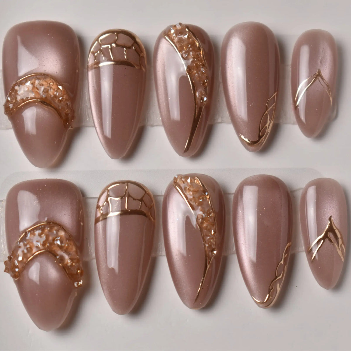 Smooth satin mocha tones stretch across the nails like fine silk, overlaid with molten gold textures that flow like liquid sunlight. Fine geometric lines balance the organic shimmer, lending the set a modern architectural edge. This design carries the understated power of gold — luxurious without being loud, perfect for both high-fashion statements and subtle everyday sophistication.