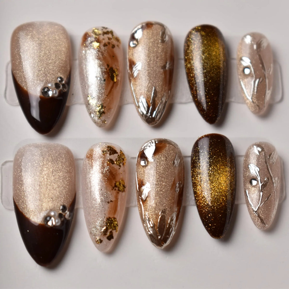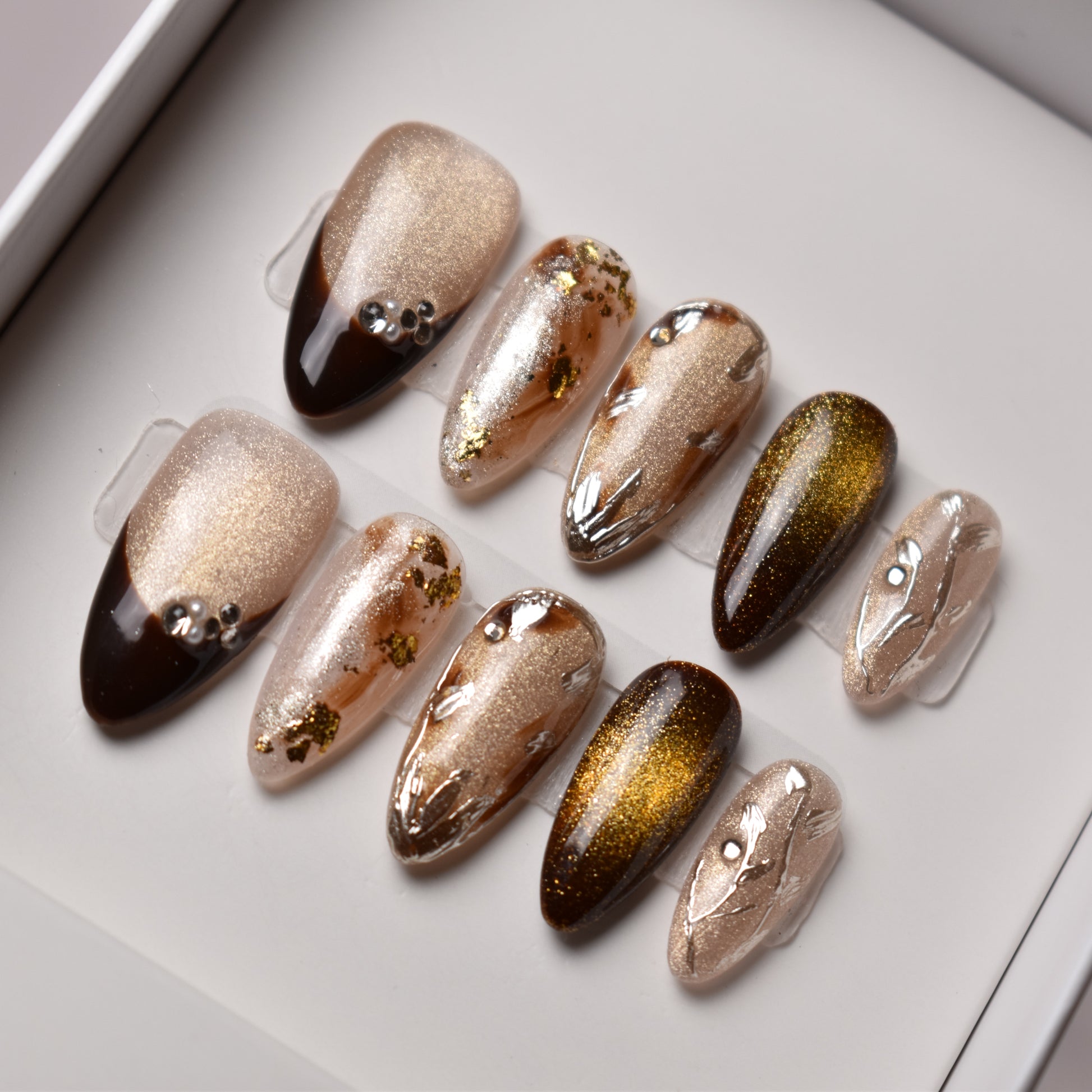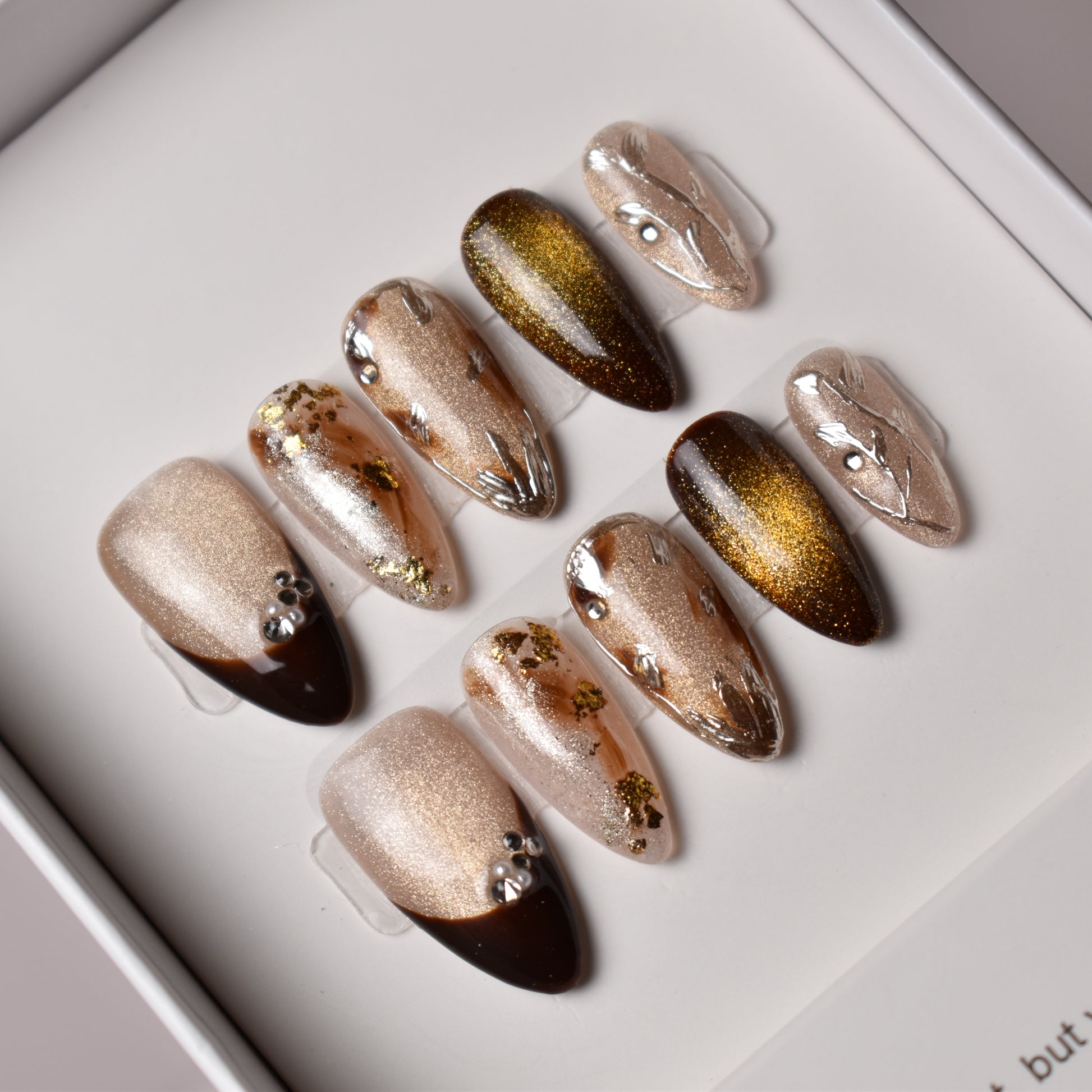 Glimmering gold fades into deep espresso brown in this captivating set, accentuated with gold foil flakes and delicate silver highlights. Each nail sparkles like city lights under the night sky, while the color transitions evoke the quiet mystery of dusk. Ideal for glamorous evening events and sophisticated cocktail parties.
