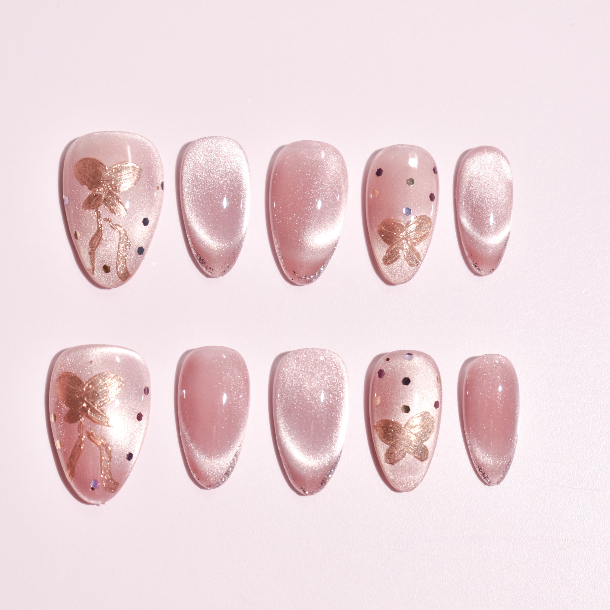 This design features a luminous blush-pink base with a pearly, light-reflective finish that shifts subtly under different lighting. Hand-painted metallic butterfly accents flutter across select nails, paired with scattered micro glitter flecks for a dreamy, weightless effect. The overall look is elegant yet playful—perfect for those who love soft glamour without heaviness.