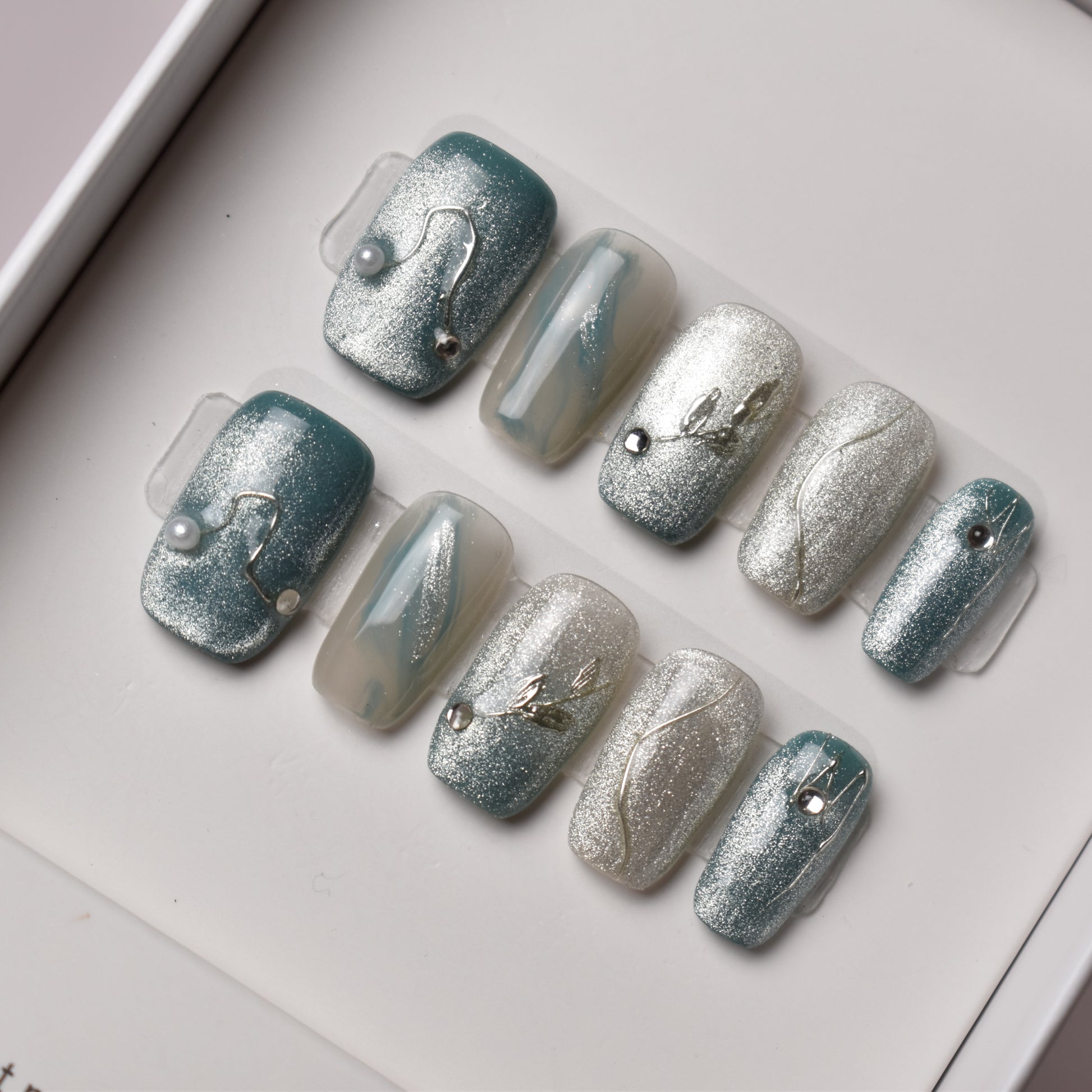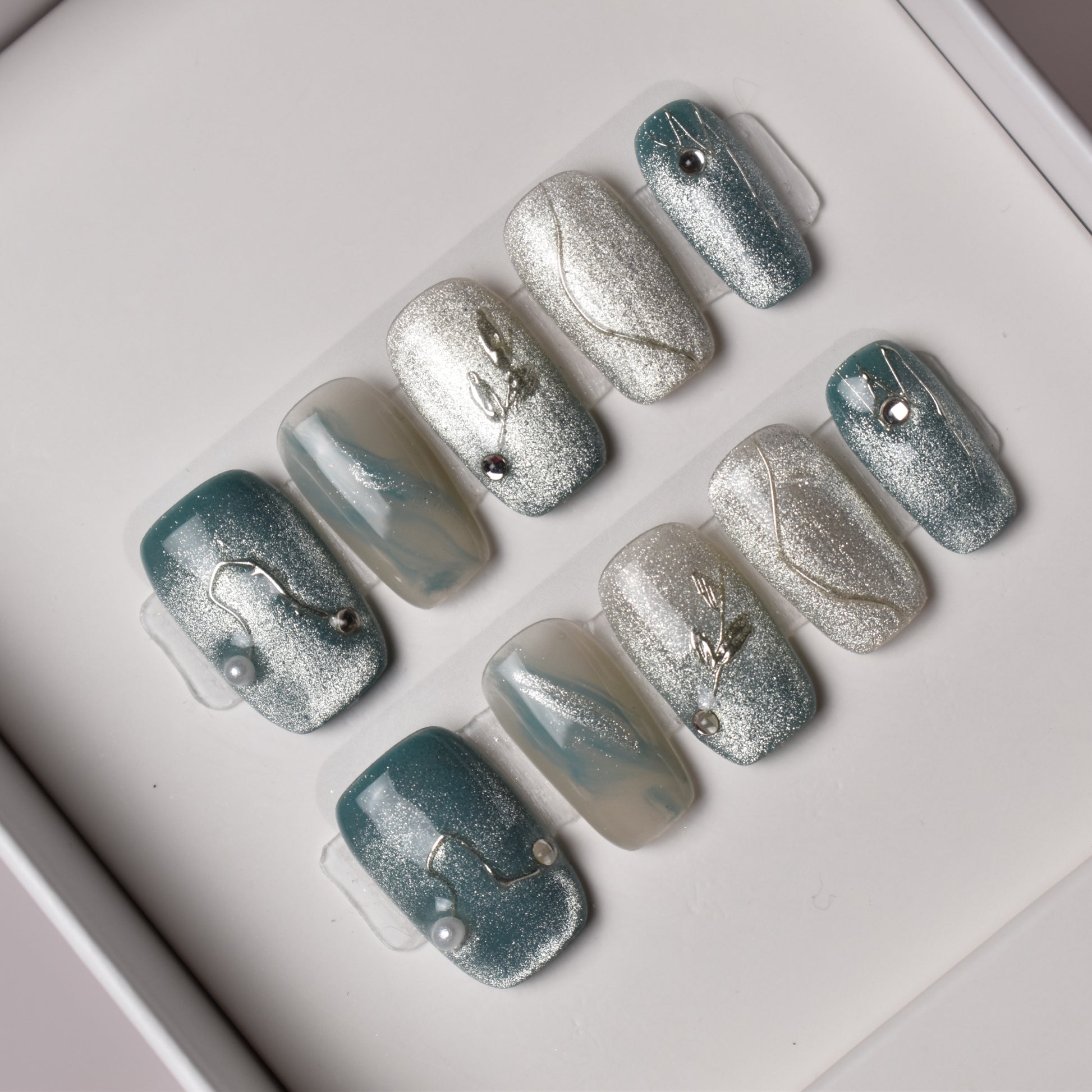 A serene blend of deep teal, icy silver, and misty white that evokes the quiet elegance of a snow-covered forest. Shimmering silver glitter captures the sparkle of frost on pine needles, while translucent marble accents mimic frozen streams. Tiny pearls and crystals add a gentle touch of winter magic, perfect for anyone seeking a refined, cool-toned look with a whisper of nature’s stillness.
