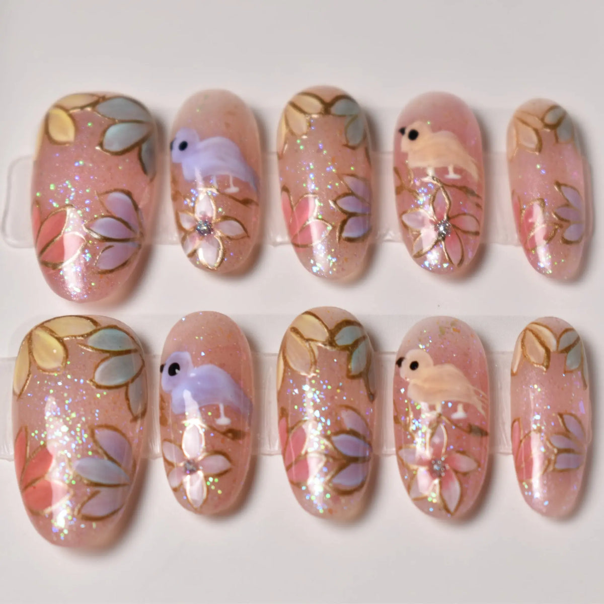 A glistening blush base cradles hand-painted birds among pastel leaves. The soft sparkle recalls sunbeams filtering through branches, as a songbird pauses mid-tune.