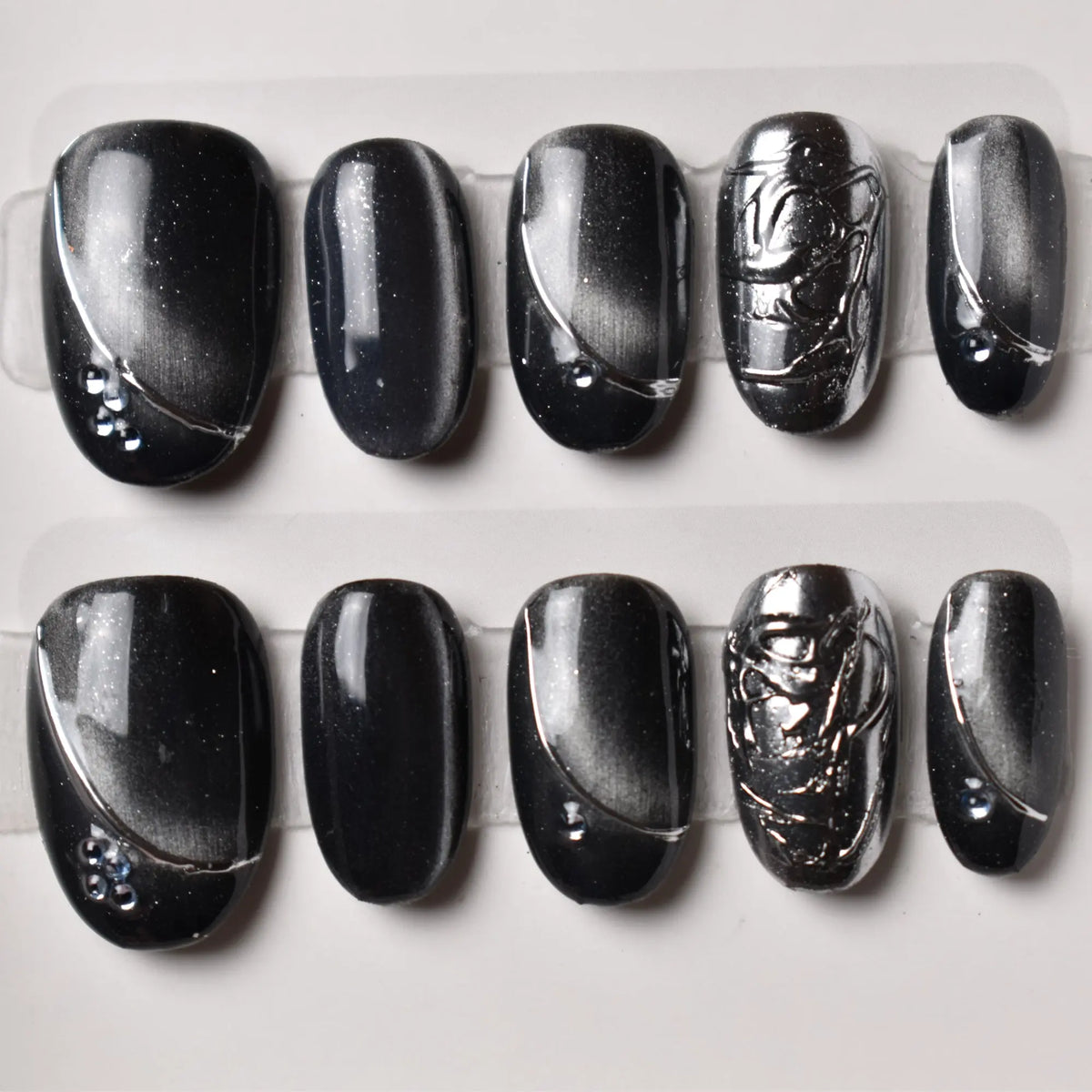 - 10 uniquely designed, hand-painted press-on nails made with high-quality UV gel.