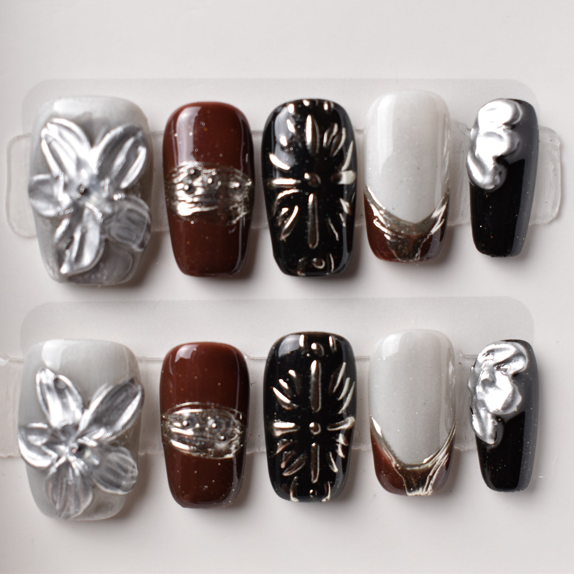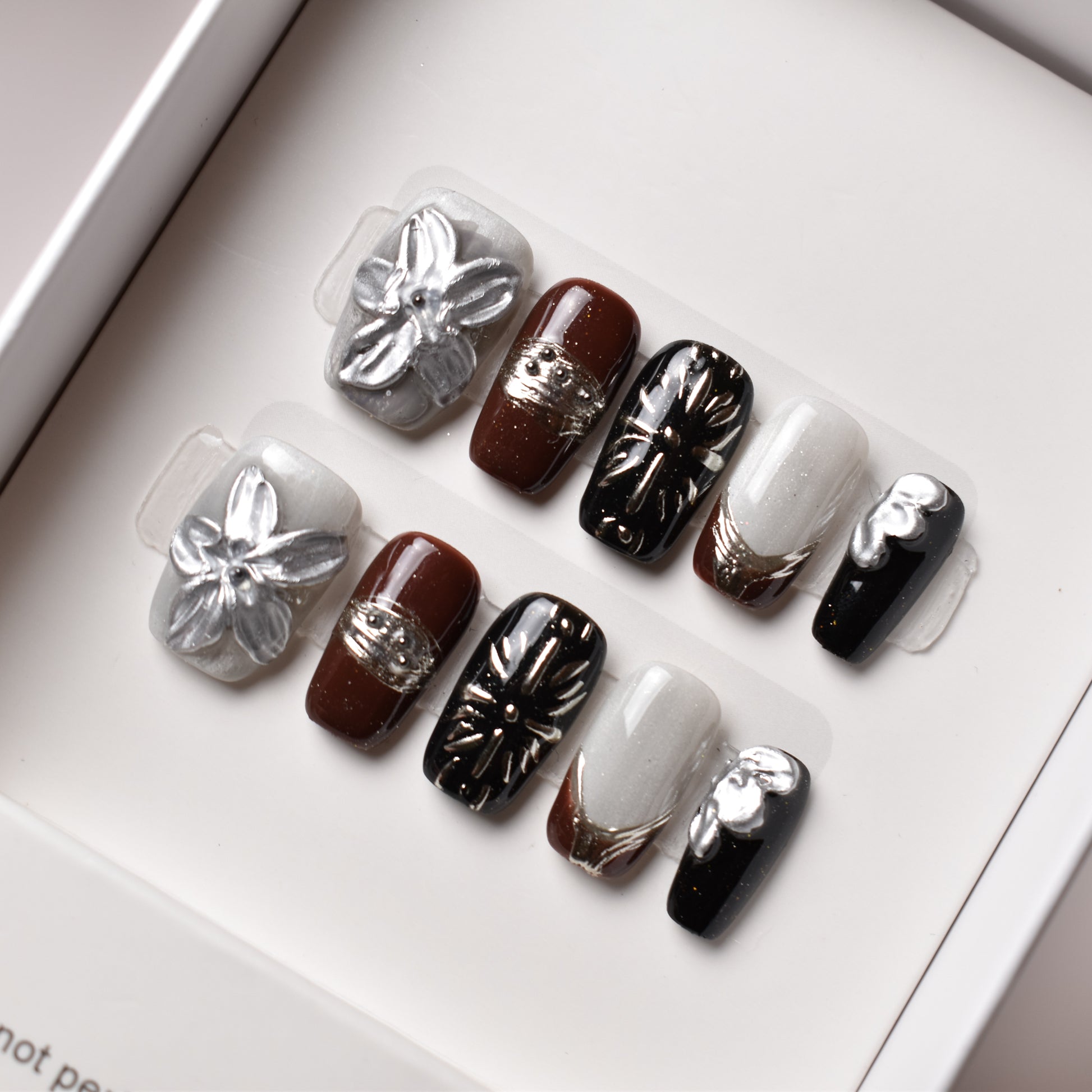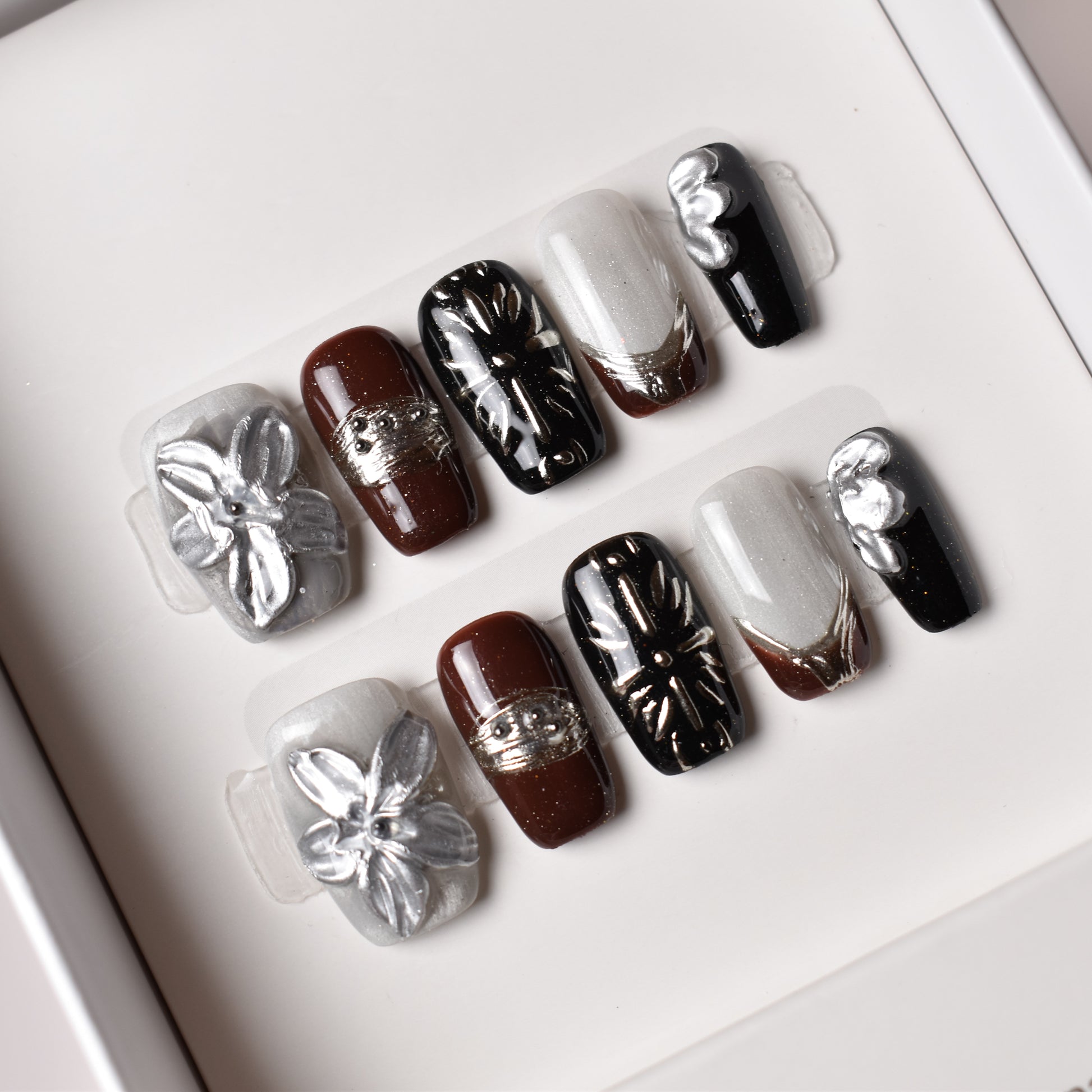 Strong and refined, this set weaves black, chocolate brown, and pearl-white bases with metallic silver floral details. The bold palette carries an air of quiet strength, balanced by the softness of petal shapes. Perfect for business elegance, evening galas, and occasions where grace meets resolve.