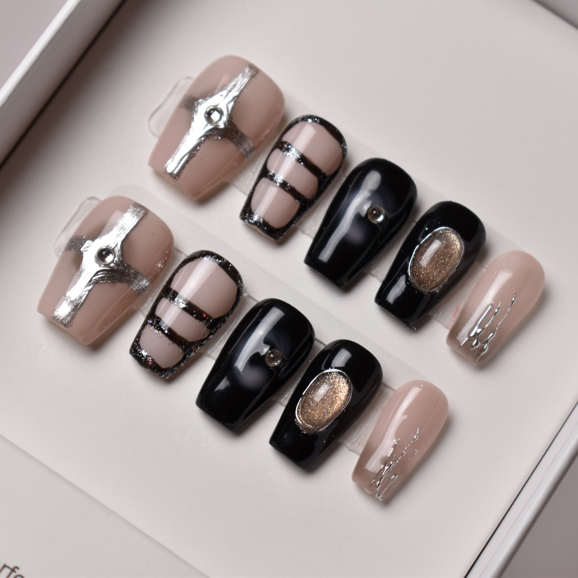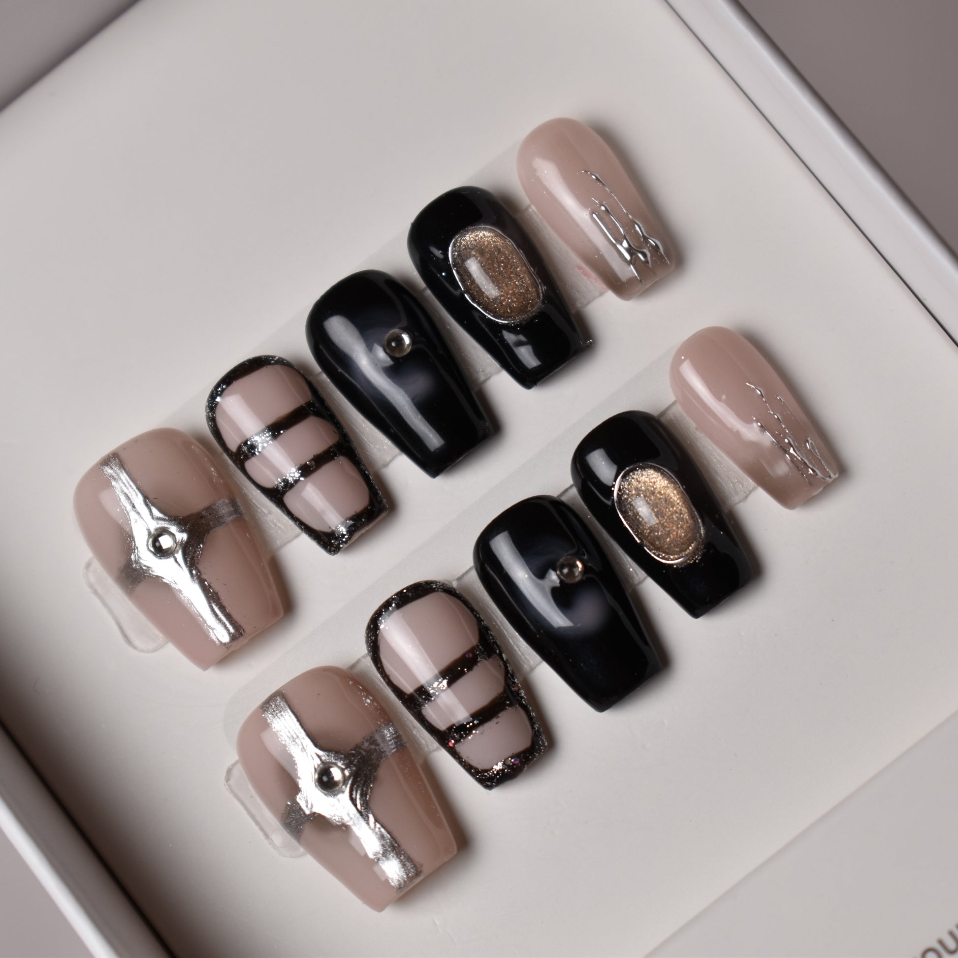 Edgy and modern, this set pairs matte black with nude tones, accented by silver foil, metallic studs, and bold geometric lines. The contrasting textures evoke strength and unity, perfect for fashion-forward looks, urban nights, and avant-garde style.