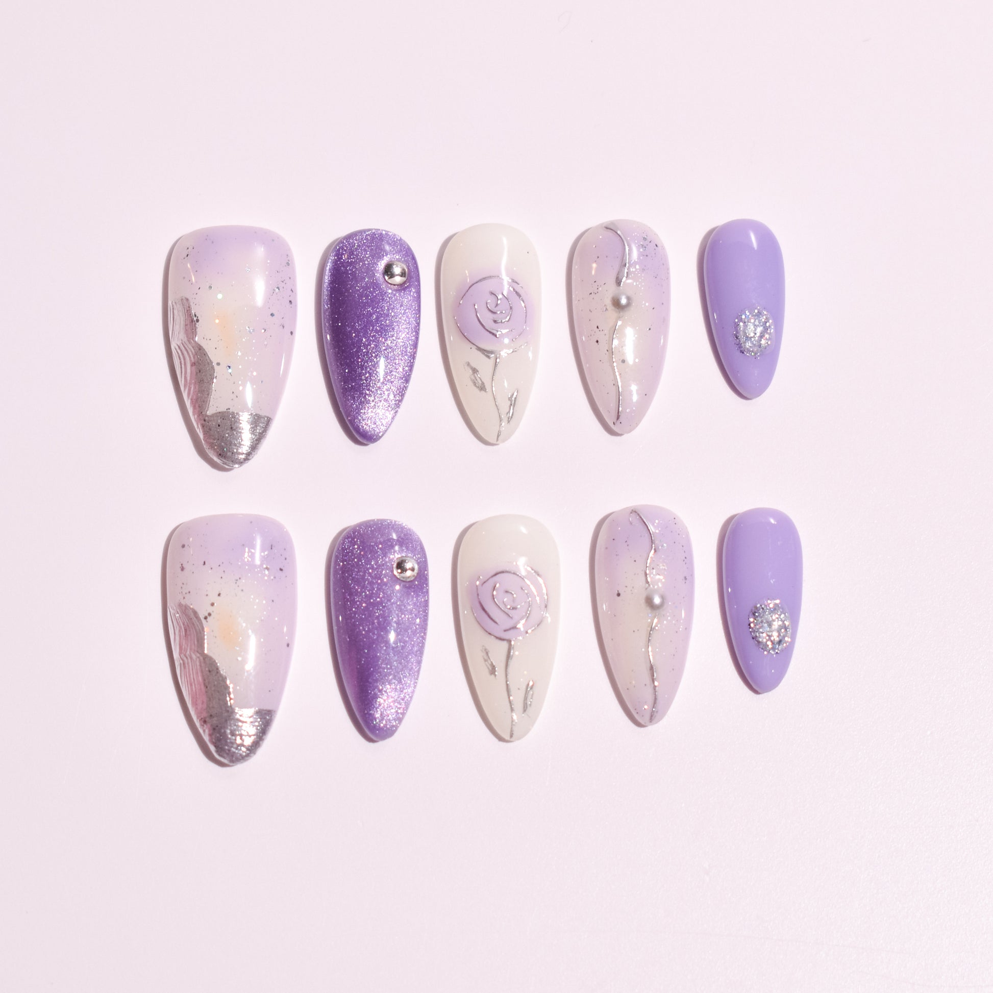 This set blends dreamy lavender shimmer, creamy ivory bases, and muted purple solids into a harmonious palette that feels airy yet refined. A standout feature is the hand-sculpted rose accent, delicately raised for a dimensional, jewelry-like effect. Subtle pearl details and silver chrome lines add movement and light-catching contrast without overpowering the softness of the design.