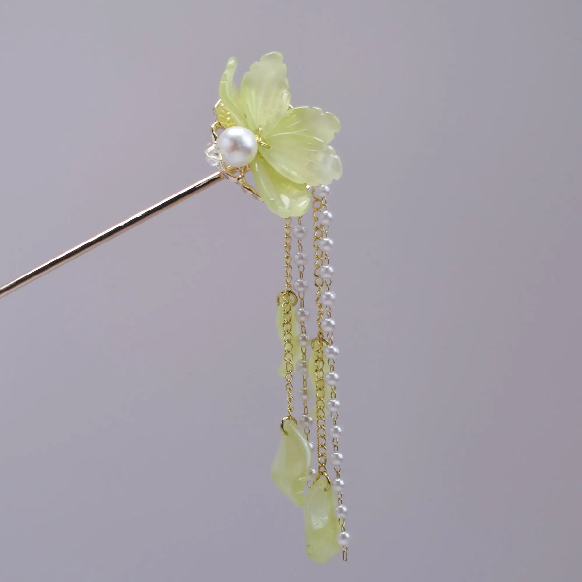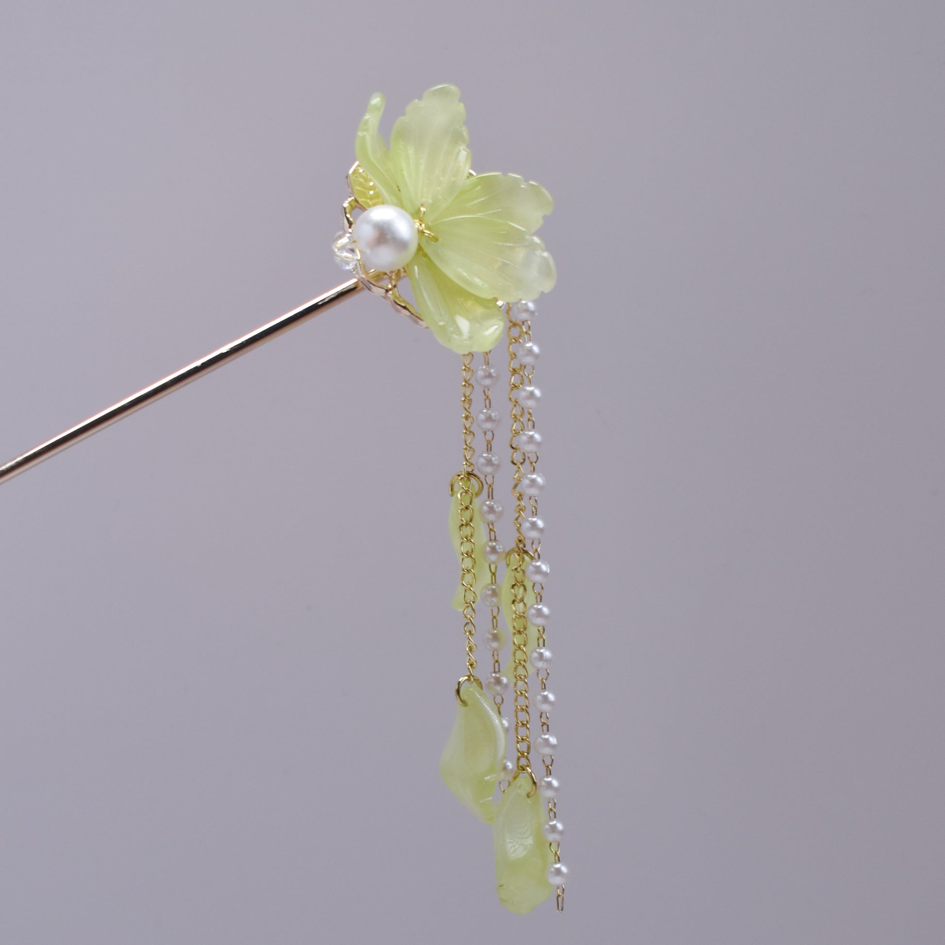 Soft, graceful, and beautifully detailed—this Lemon Blossom Tassel Hairpin brings a fresh spring charm to any hairstyle. The translucent pale-yellow flower features a luminous pearl center, creating a delicate and elegant focal point. Flowing tassels made of gold chains, pearl beads, and matching resin petals add movement and shimmer with every step.