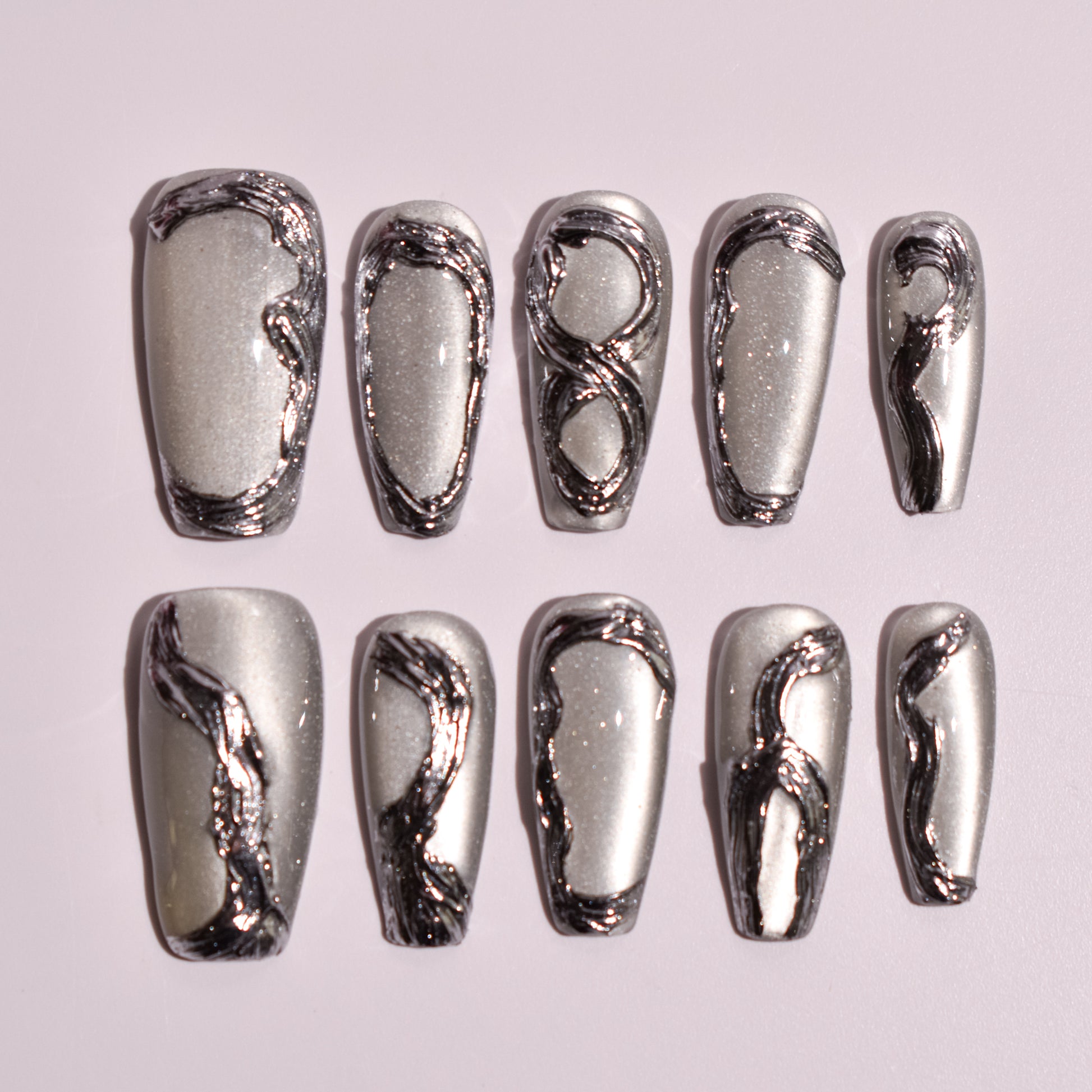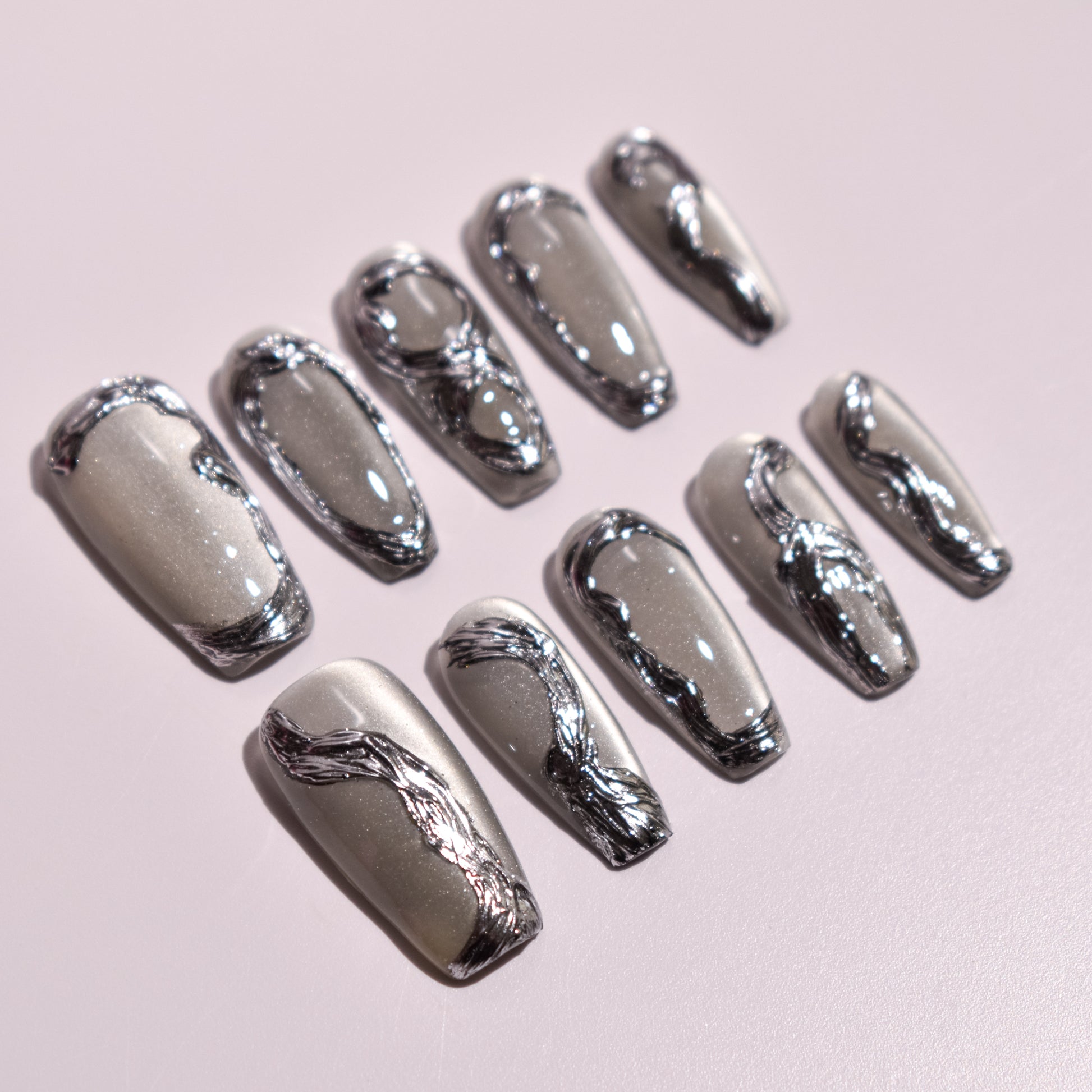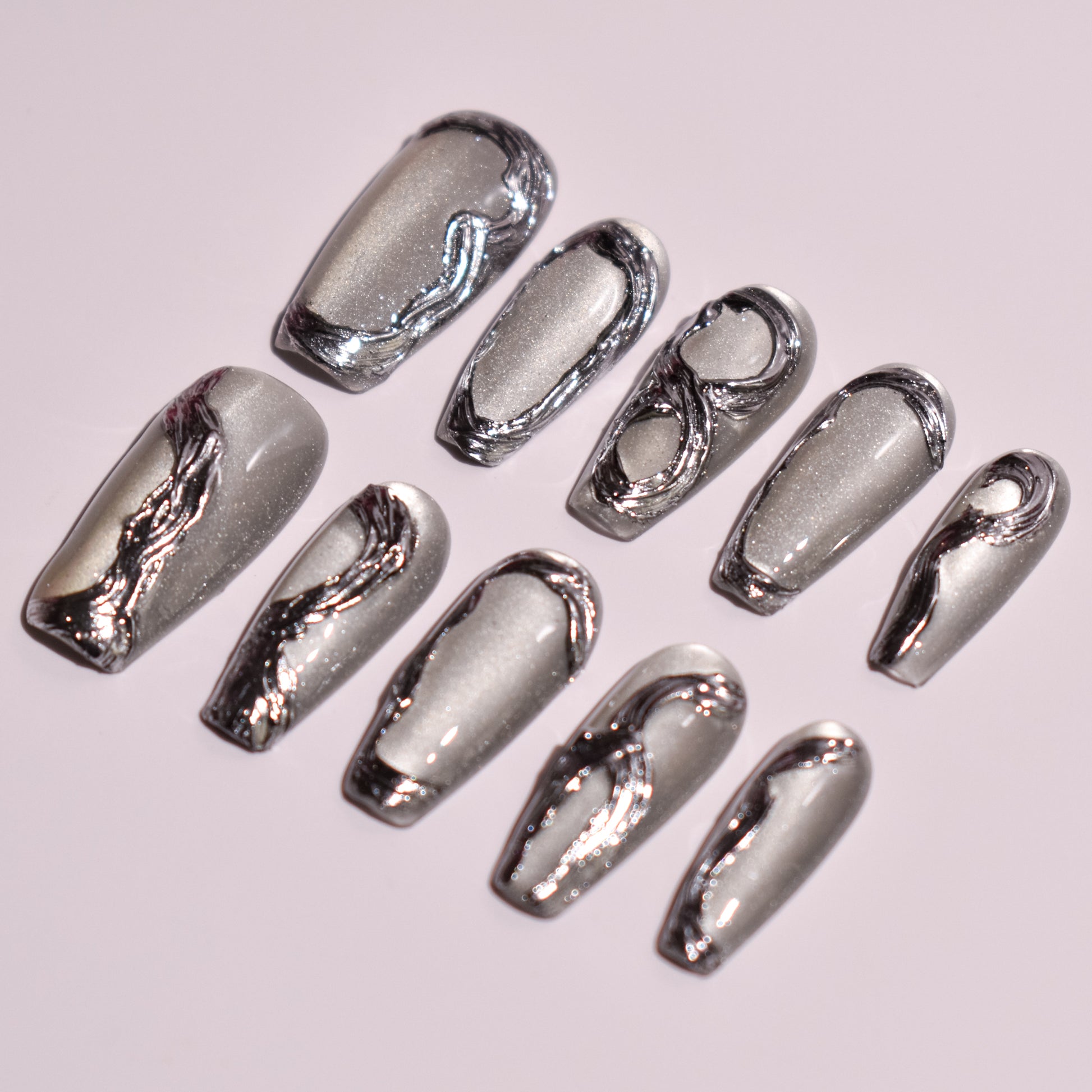 Finished with a high-gloss topcoat, the set achieves a glassy, reflective shine that amplifies the chrome effect and pearl shimmer. The sculpted gel construction ensures durability, structure, and a smooth, salon-quality feel, with all details seamlessly sealed for long-lasting wear. Bold yet understated, this set is ideal for lovers of luxury press-on nails, silver chrome nails, abstract nail art, minimalist statement nails, and trending coffin nail designs that feel modern, powerful, and effortlessly chic.