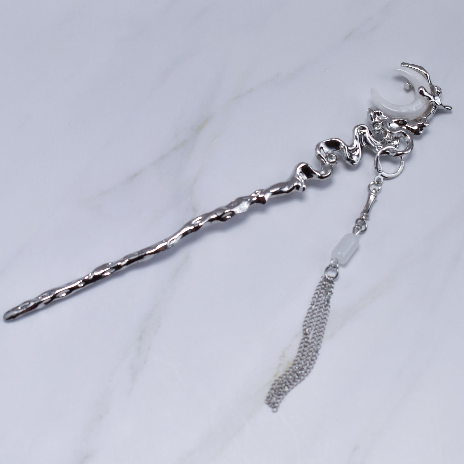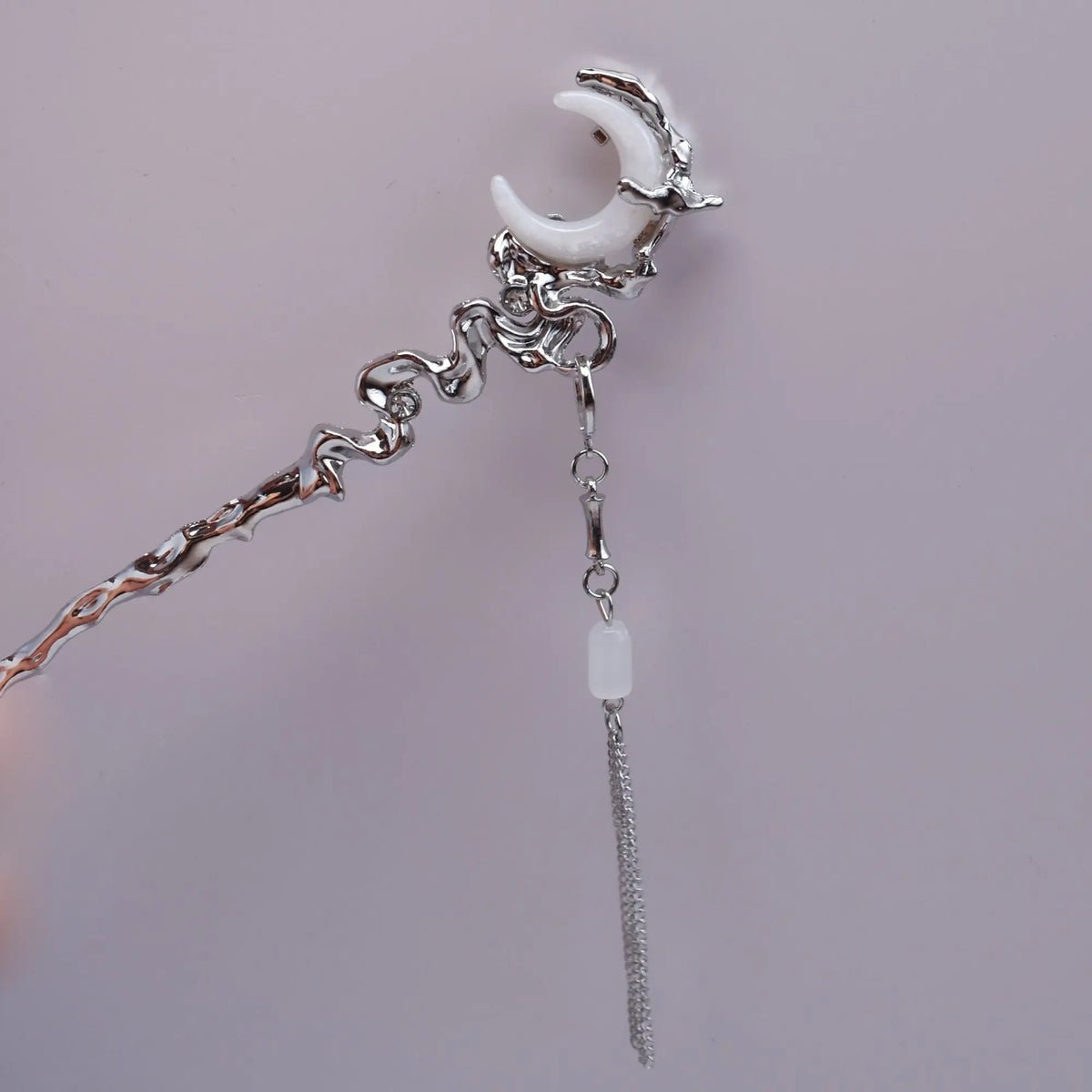 Elegant, mystical, and sculpted with a flowing silver sheen, the Lunar Frost Crescent Hairpin captures the quiet beauty of a moonlit night. Topped with a smooth white crescent moon embraced by molten-style silver branches, this piece brings a touch of fantasy and celestial charm to any hairstyle.