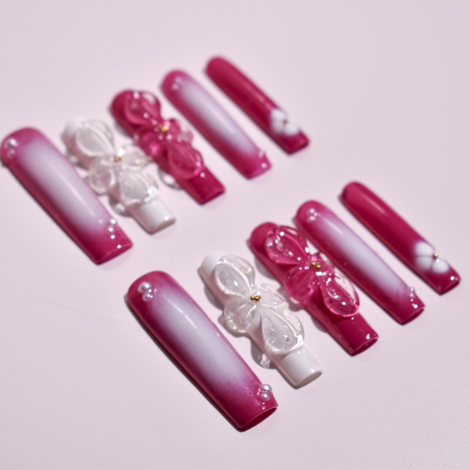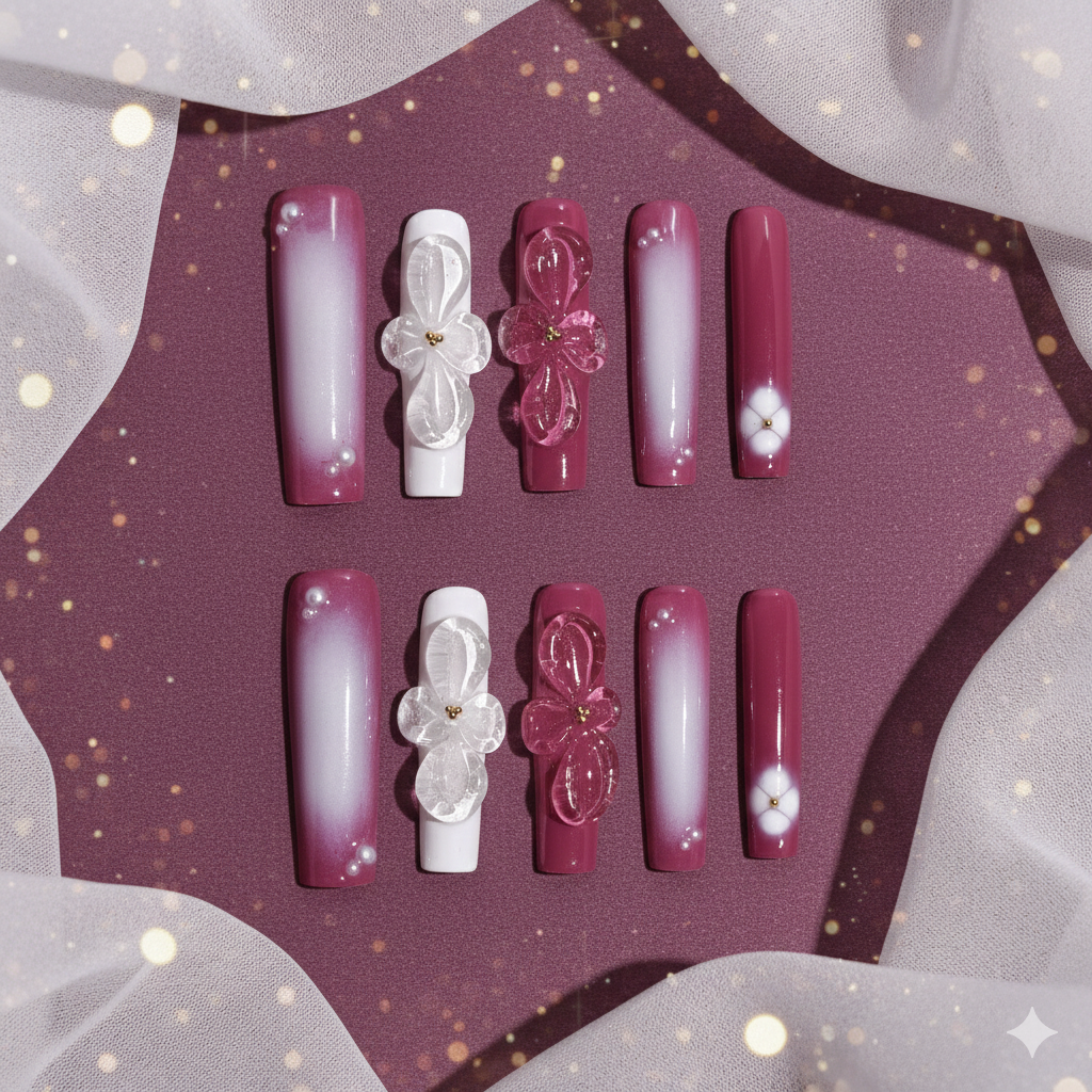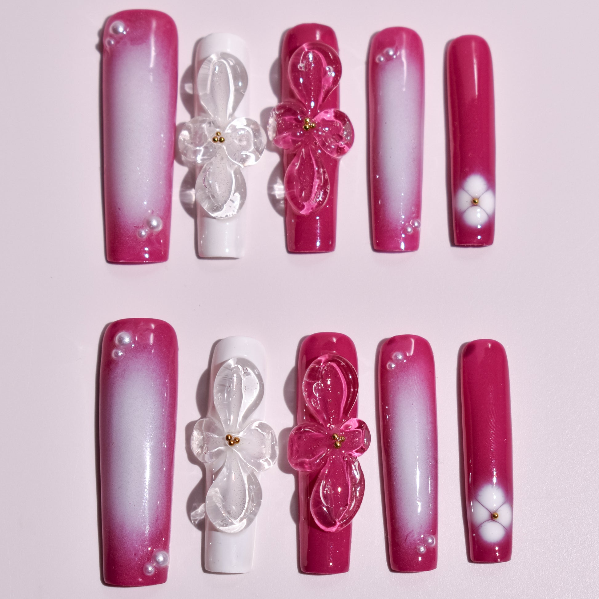 The artistic core of this set lies in its magnificent sculpted gel embellishments. Large, translucent 3D floral charms in matching magenta and clear crystalline finishes serve as breathtaking focal points, each anchored with delicate golden centers. Complementing these central pieces are meticulously hand-painted white floral motifs and strategically placed pearl accents that add a touch of soft, iridescent texture across the vibrant aura base.