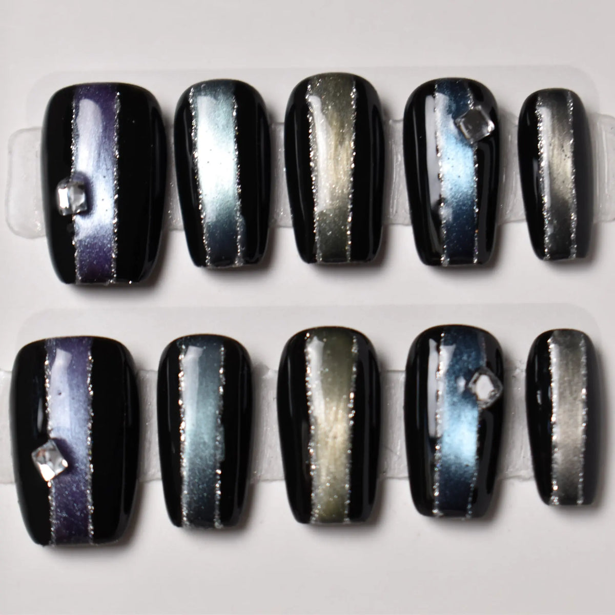 Inky black lacquer reveals magnetic aurora bands shifting from indigo to pewter and olive, accented by a single crystal for a sleek, cosmic finish.