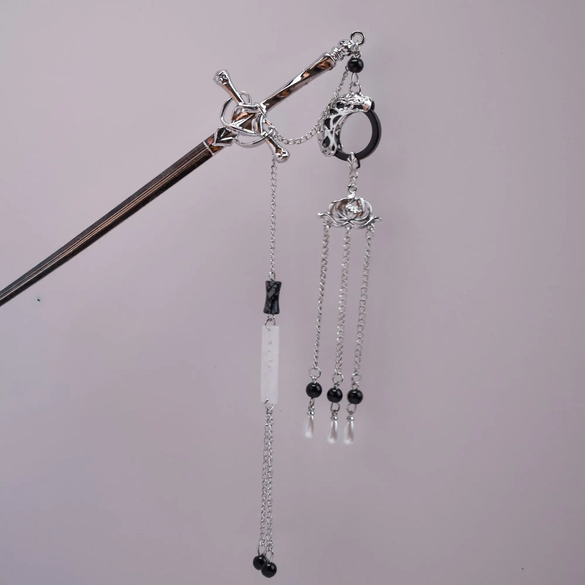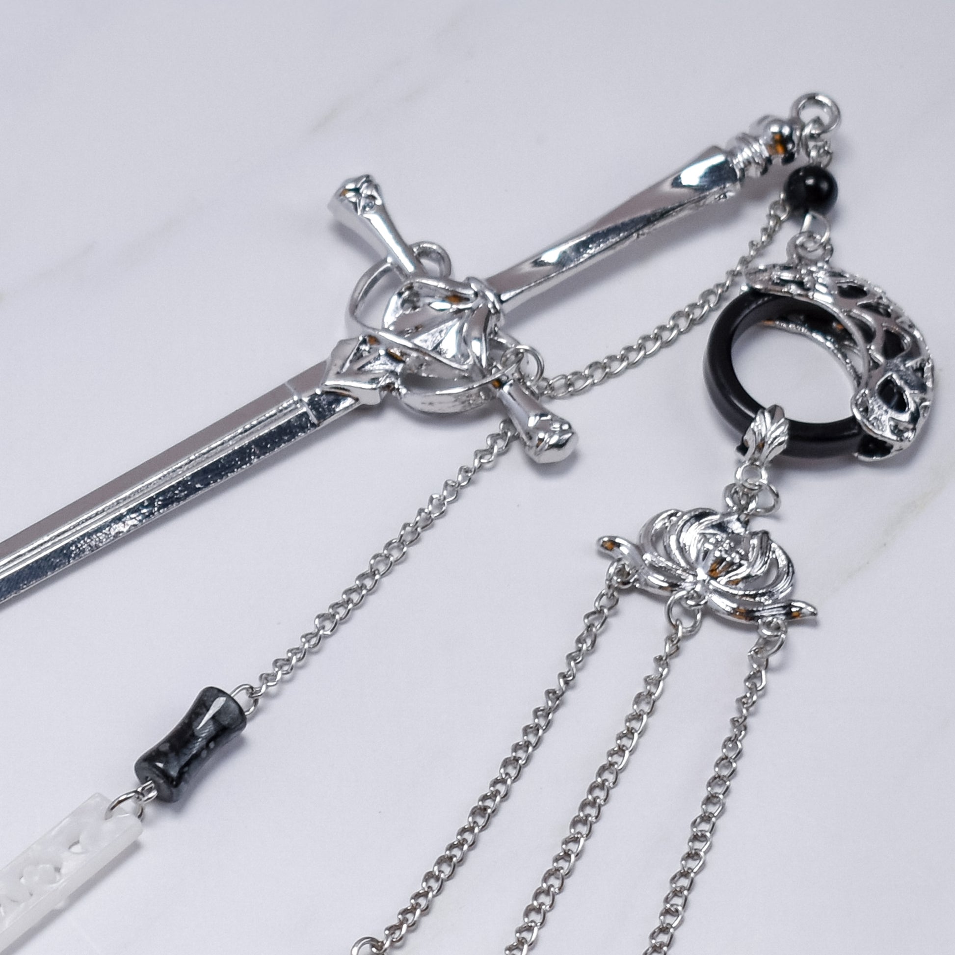 Midnight Rose Sword Hairpin – Silver Blade with Black Accents & Layered Chains