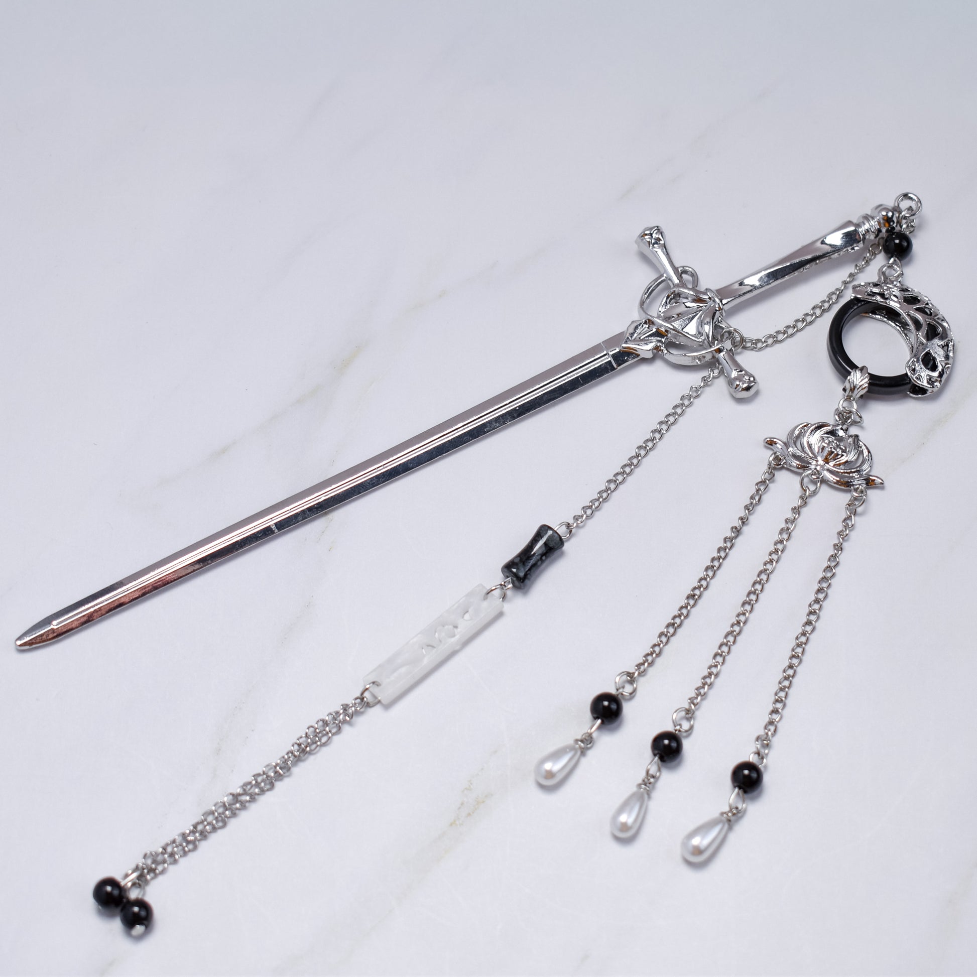 The silver sword hairpin features a polished blade and a handle wrapped in deep black enamel, creating a striking contrast. Hanging from the hilt are intricately layered charms, including: