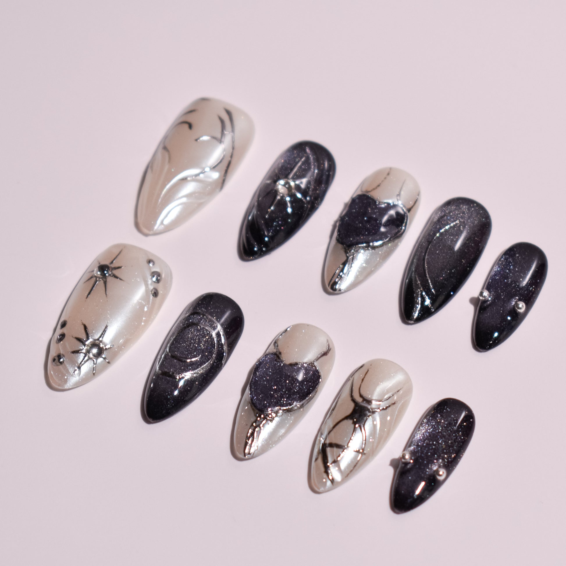 This handmade press-on nail set is sculpted in an almond shape, delivering a dramatic, elongated silhouette with a smooth, high-fashion curve. The color palette moves between luminous pearl, smoky charcoal, and deep obsidian black, layered with fine shimmer for a celestial glow. The contrast between light and dark creates a striking, editorial look that feels bold yet refined.