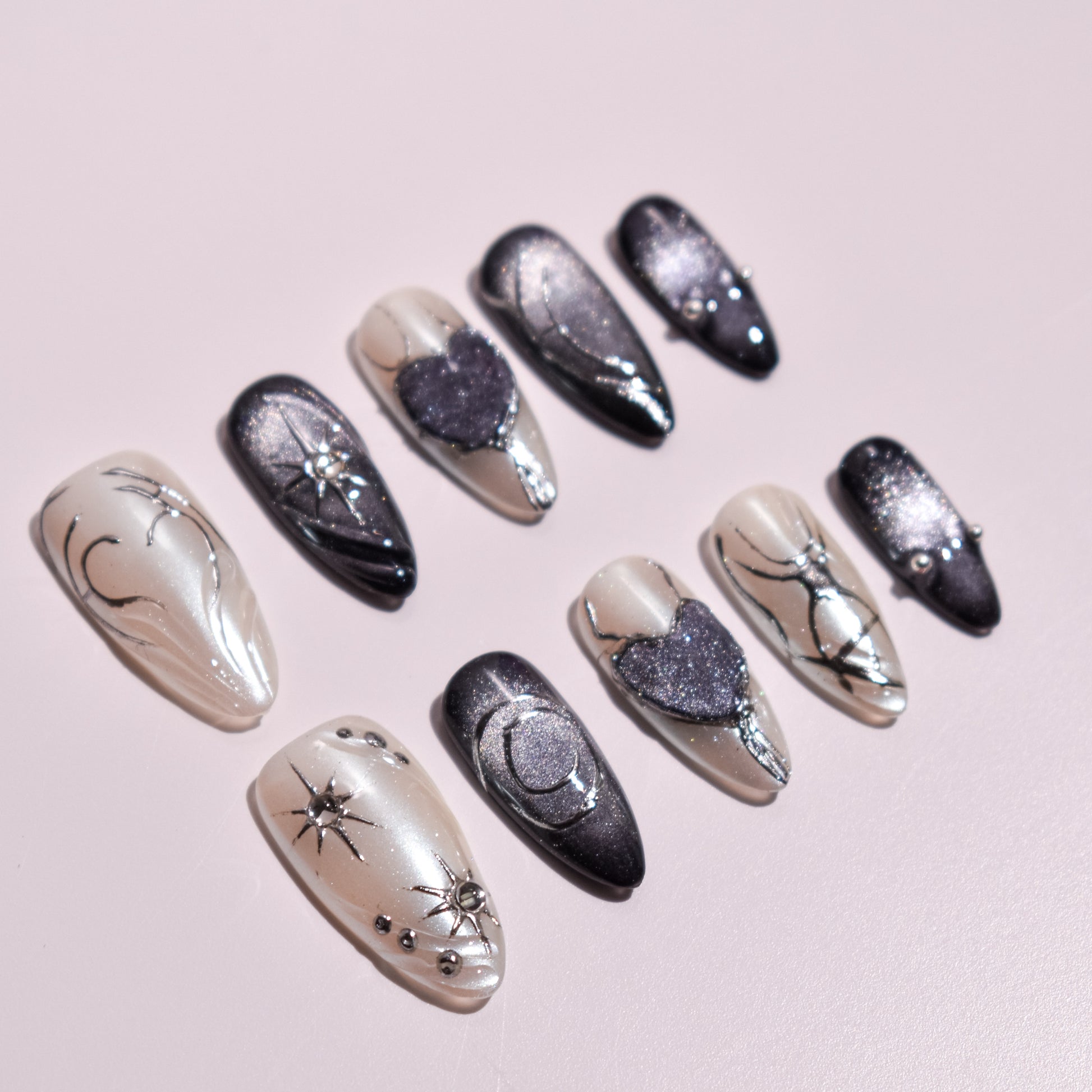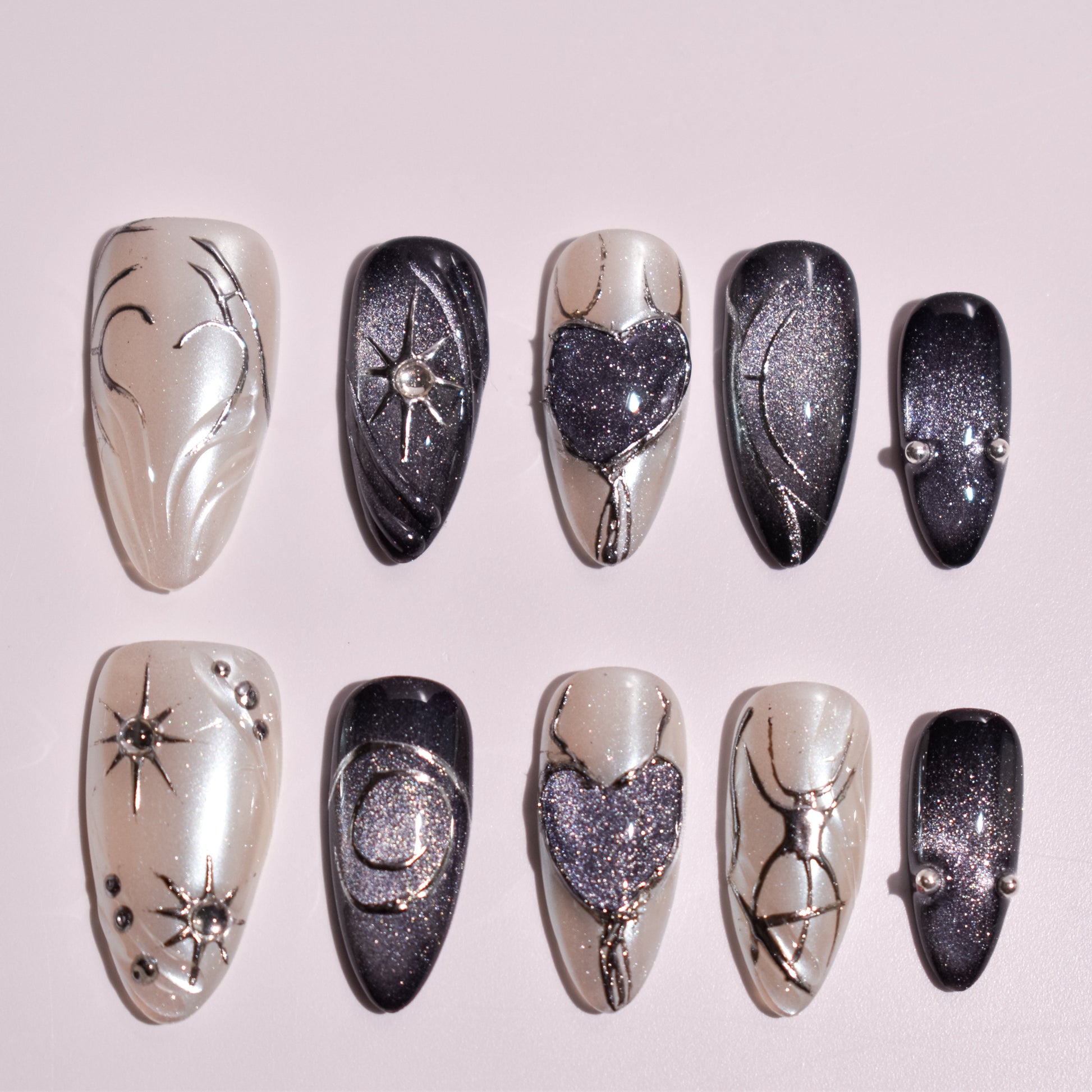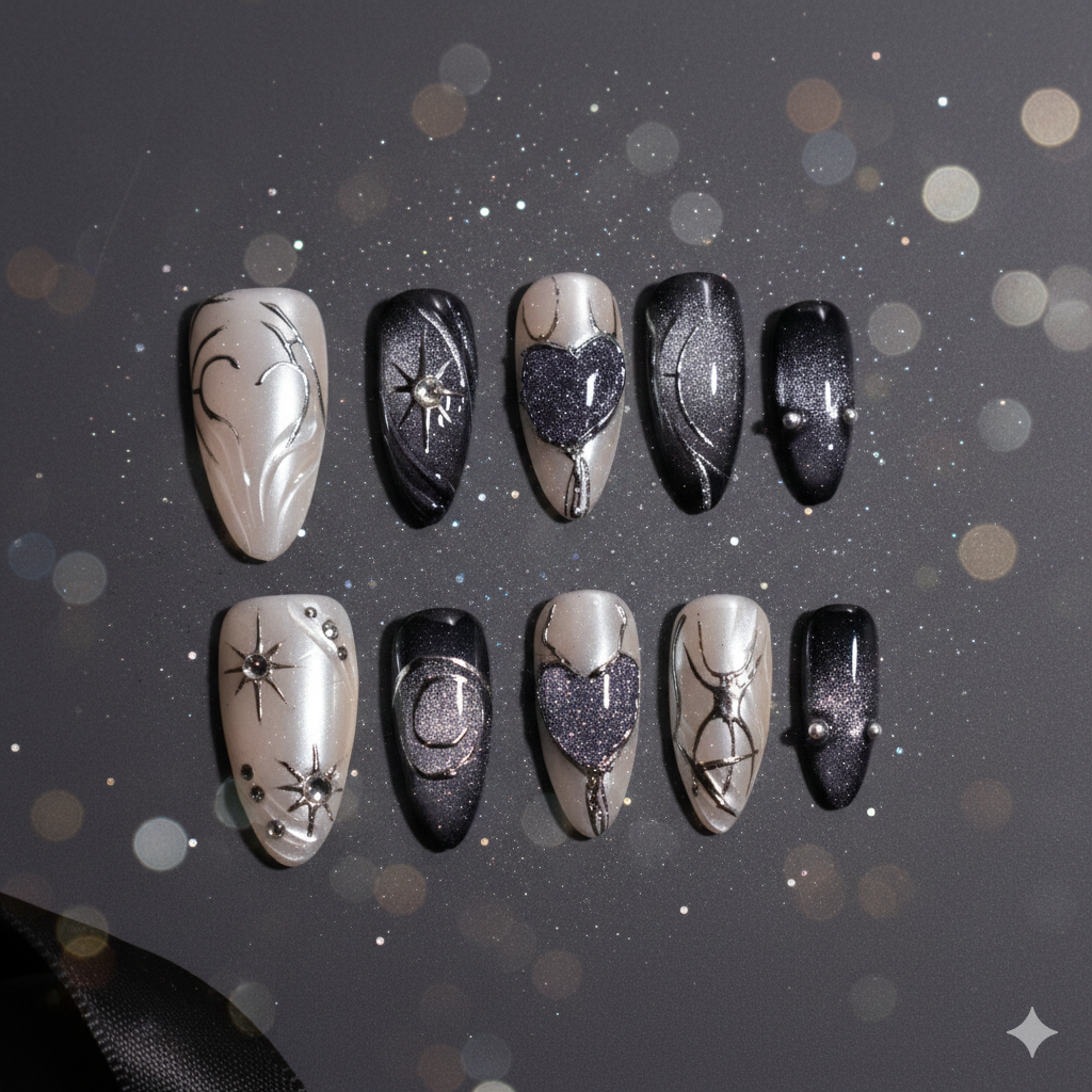 Each nail is individually designed with hand-painted metallic linework, forming abstract sigils, crescent moons, stars, and heart motifs. Select accents feature sculpted gel elements—raised hearts and dimensional symbols—built layer by layer for depth and structure. Micro-crystal studs and metallic beads are embedded with precision, adding focal points that catch the light without overpowering the design. Shimmer pigments are blended seamlessly into the base, creating smooth gradients and a cosmic, night-sky texture.