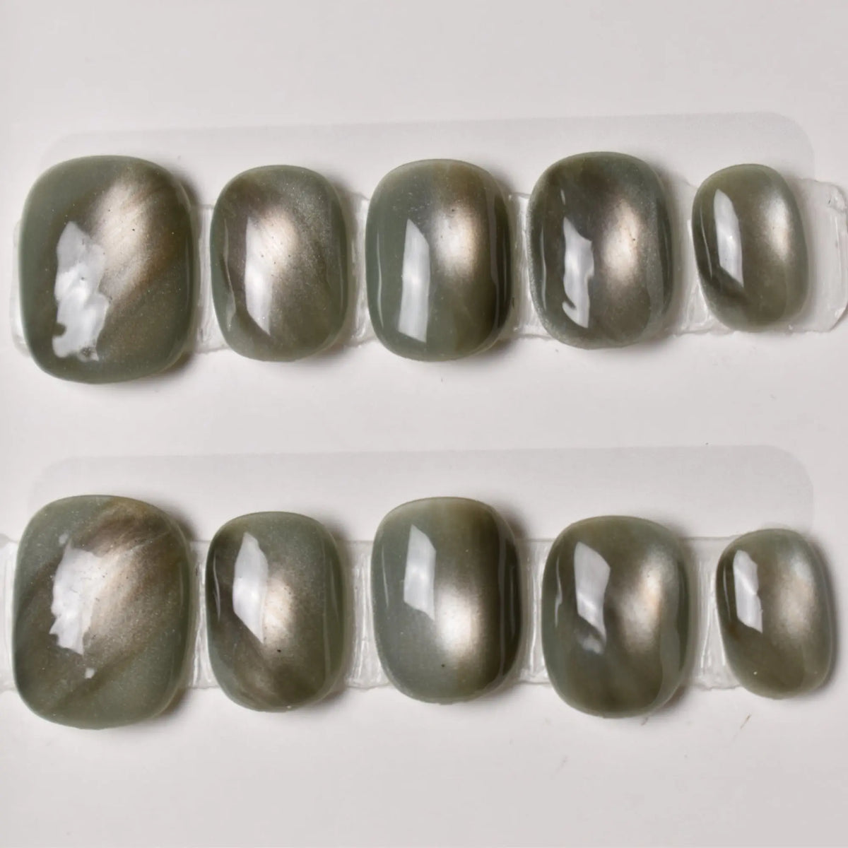 Soft olive-green cat-eye shimmer flows like liquid metal across each nail, shifting with every glance. The understated, earthy tones give a sophisticated nod to nature’s quiet beauty. A minimalist yet captivating choice.