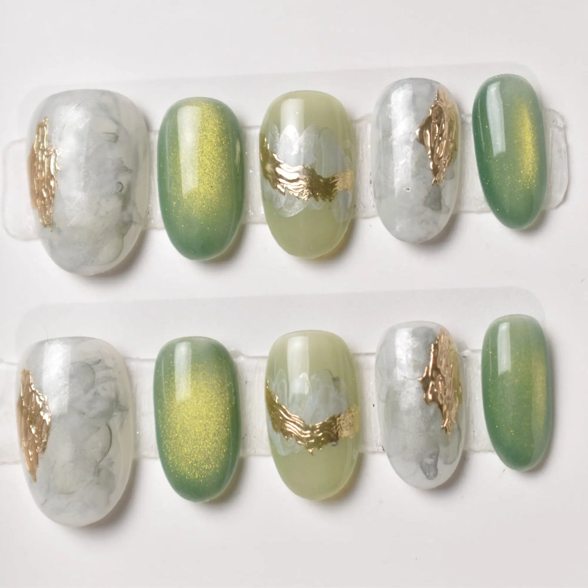 - 10 uniquely designed, hand-painted press-on nails made with high-quality UV gel.