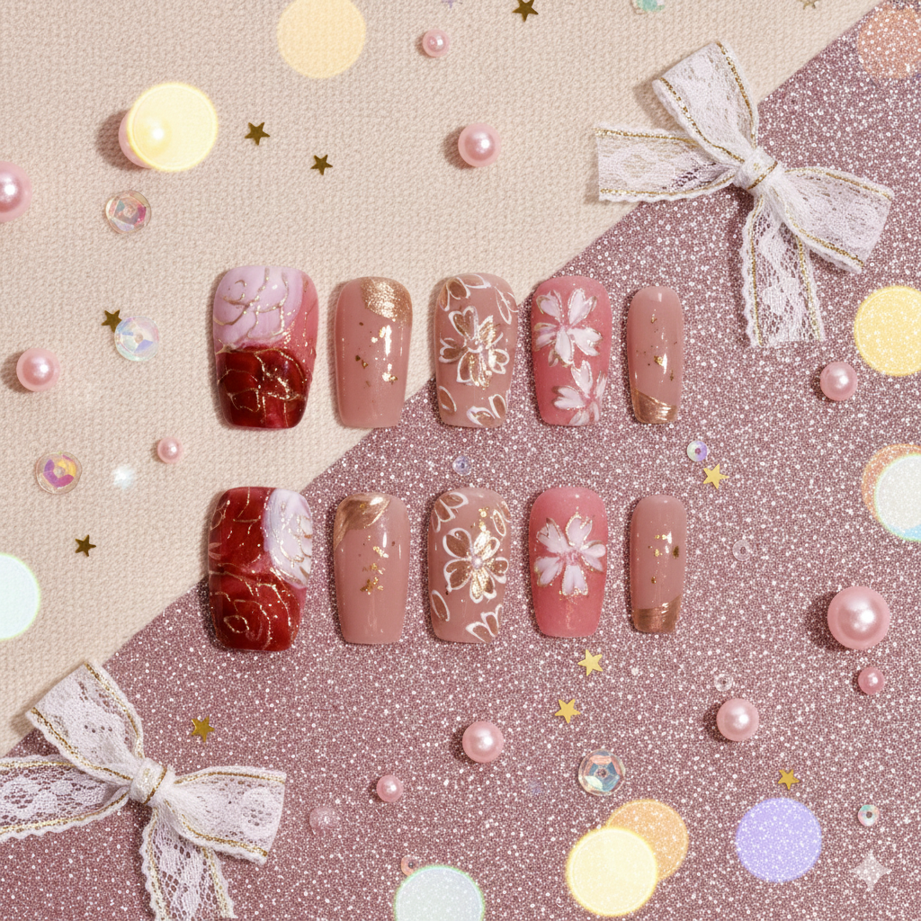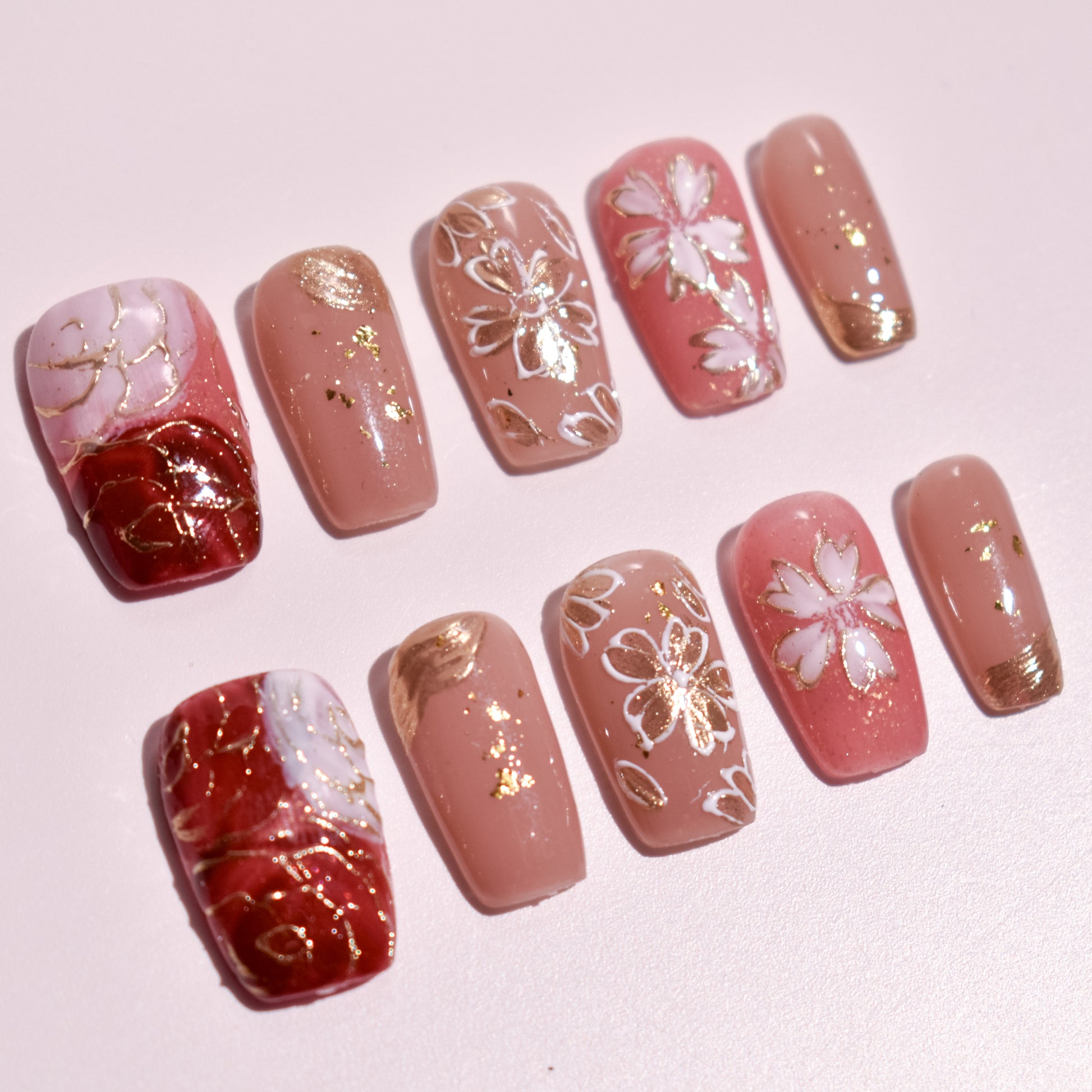 Momiji Blush Veil is a soft yet sophisticated medium Square press-on nail set inspired by falling maple leaves and delicate sakura petals layered in warm nude tones. This design blends translucent blush, soft rose pink, and deep crimson accents, finished with elegant gold foil and fine gold linework.